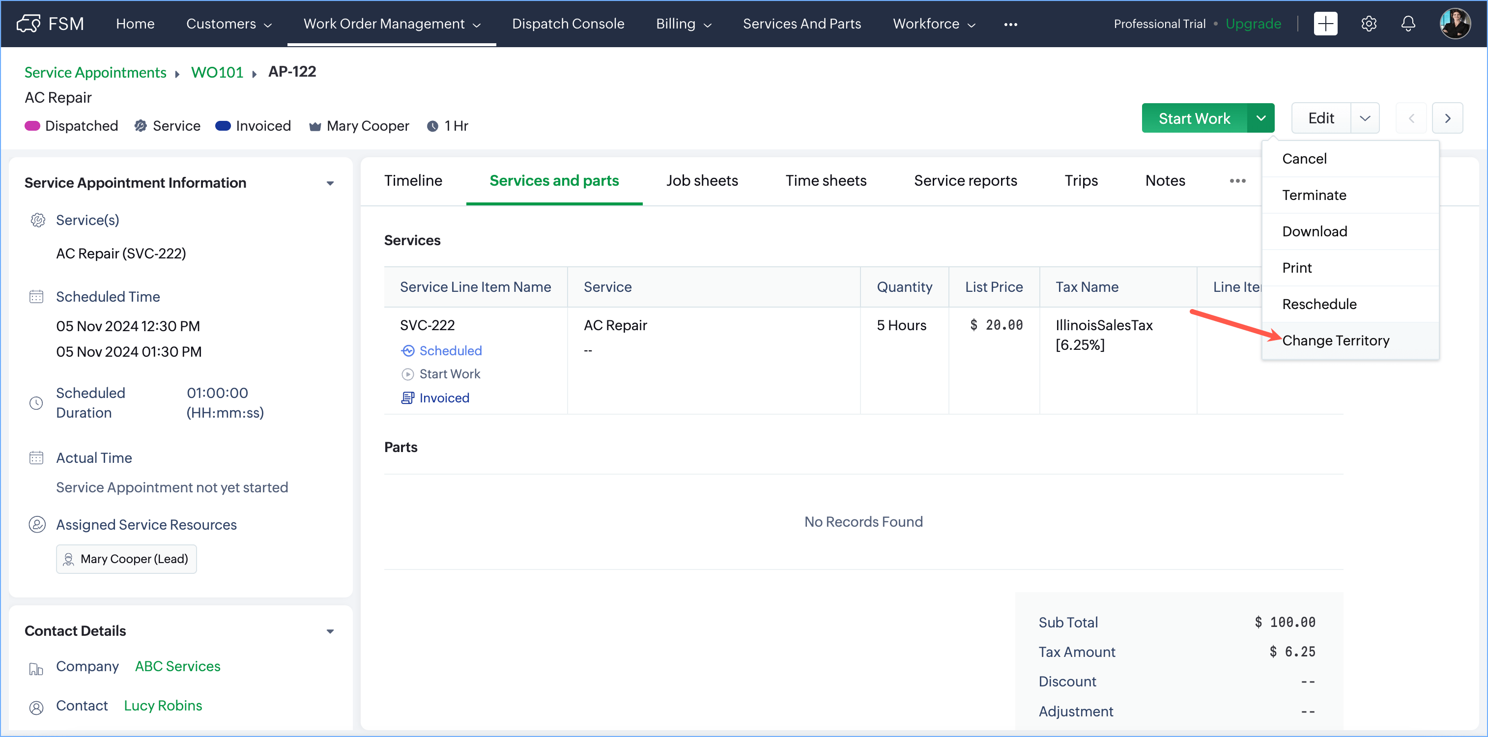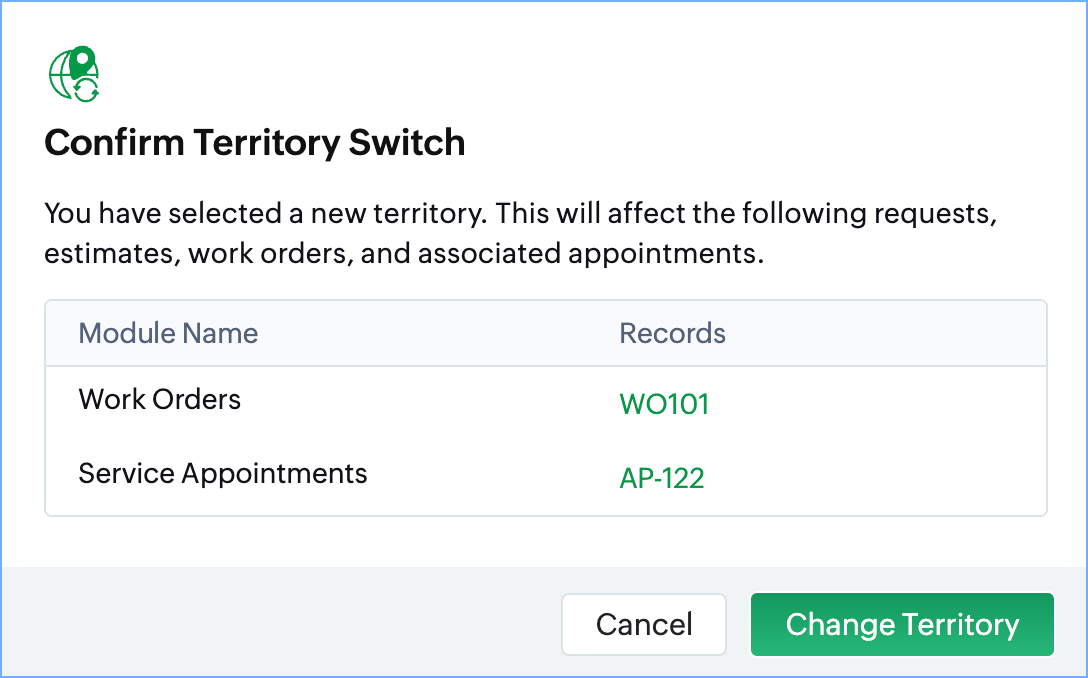 You can change the territory associated with Requests, Estimates, Work Orders, and Service Appointments. To do so: