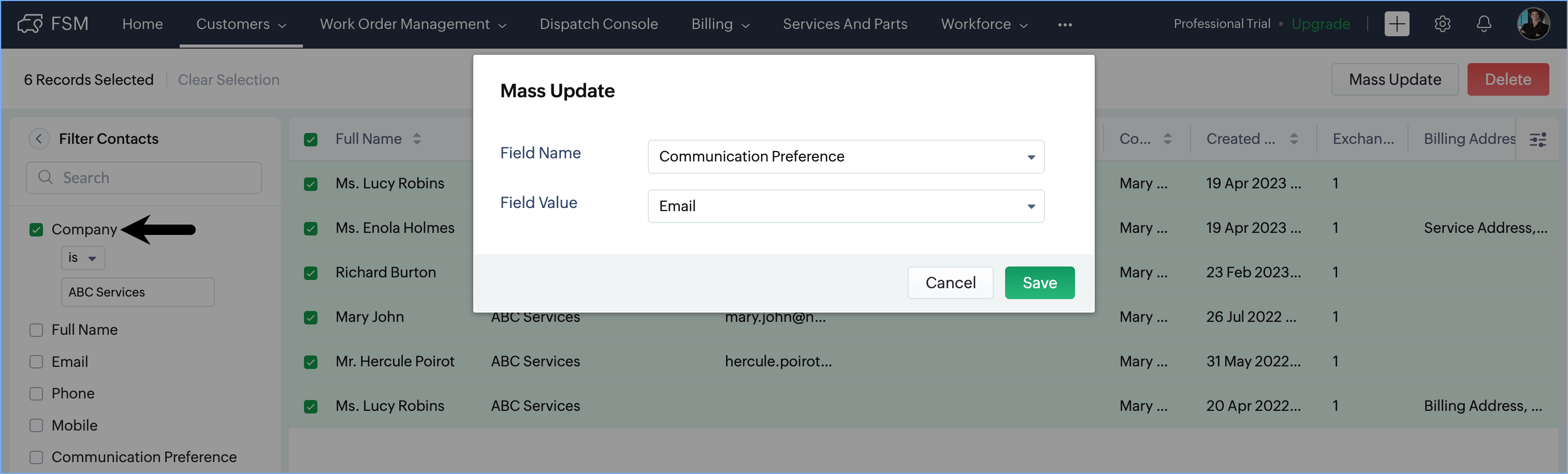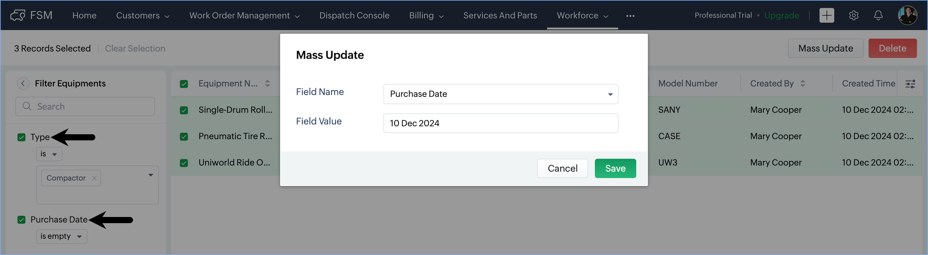 - In the Mass Update popup, select the values for Field Name and Field Value and click Save.