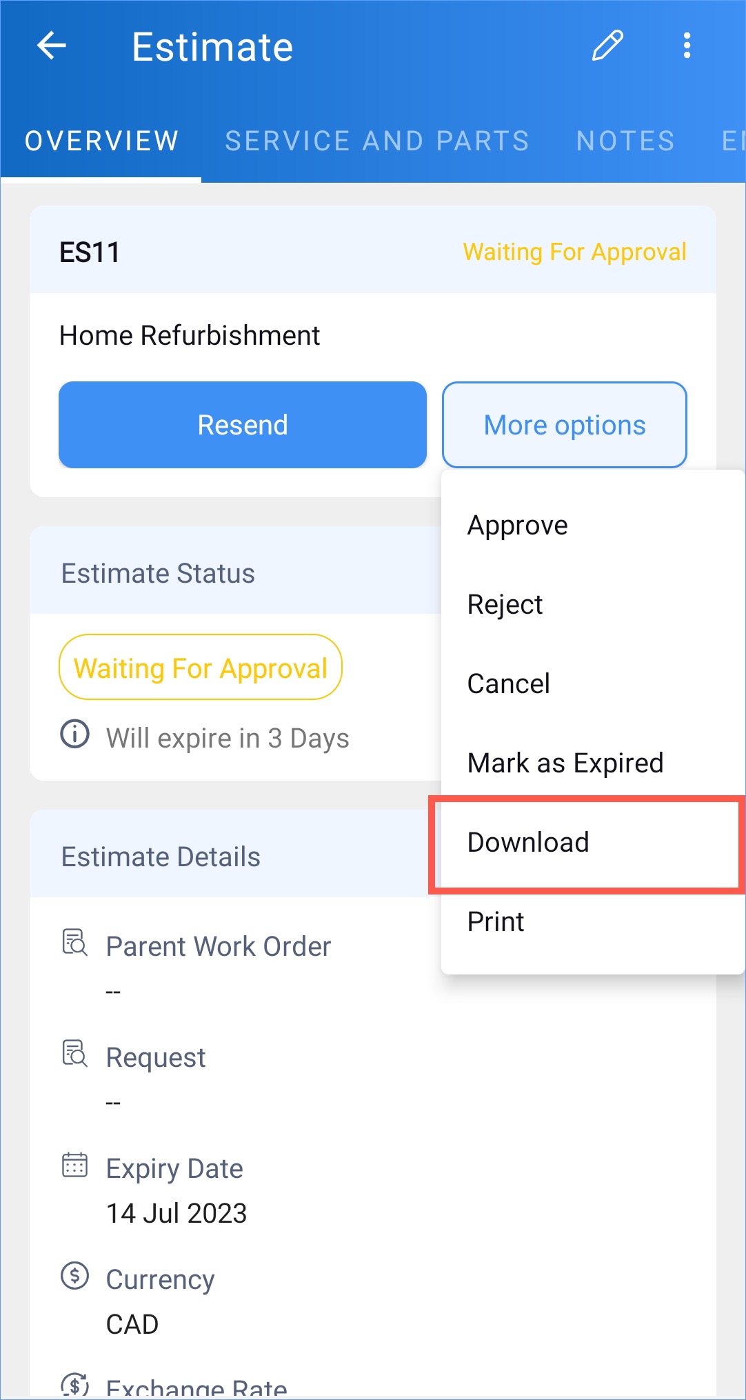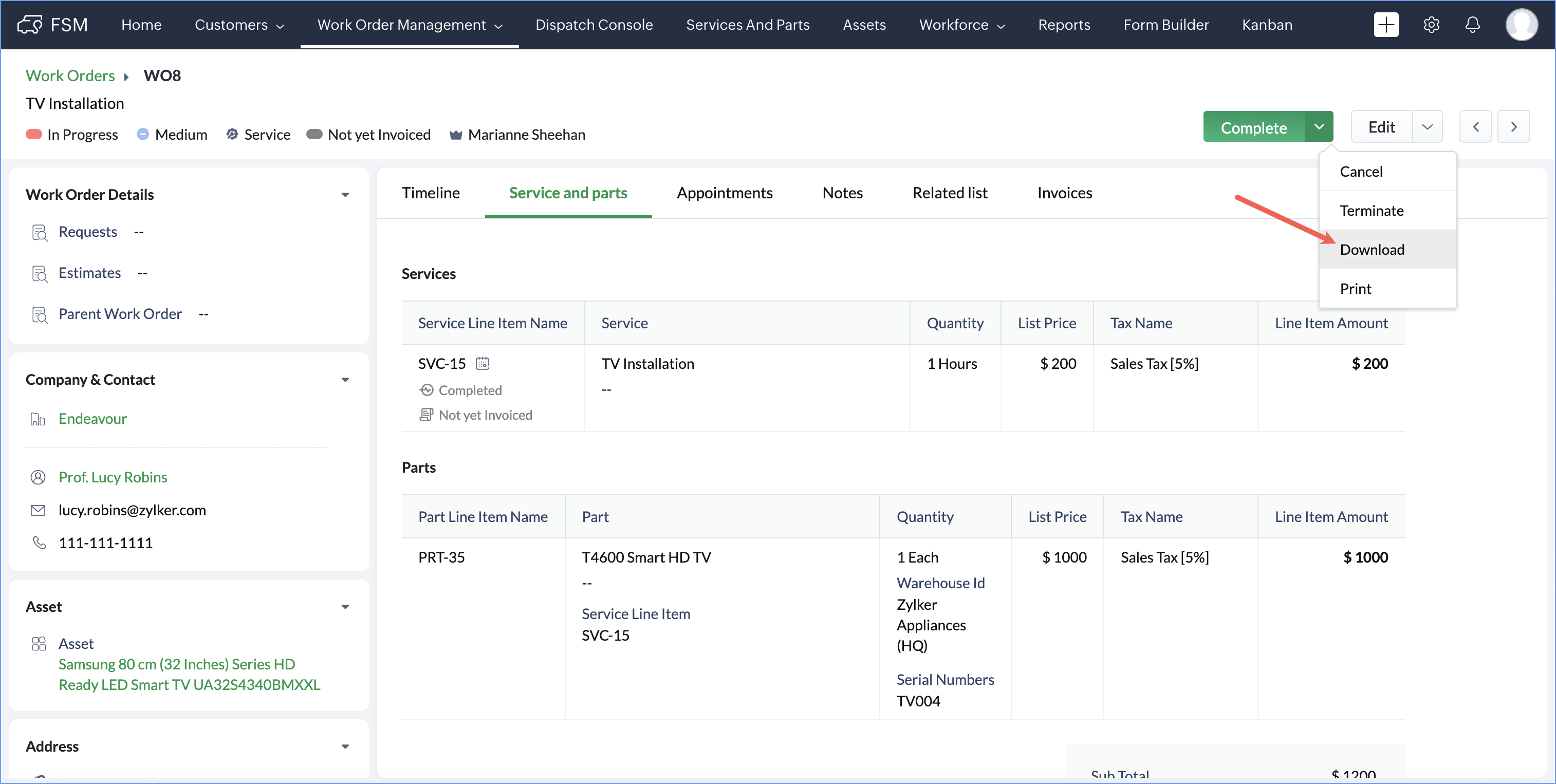 - Click the record you want to download and in the [Module] Details page, select Download from the dropdown button.