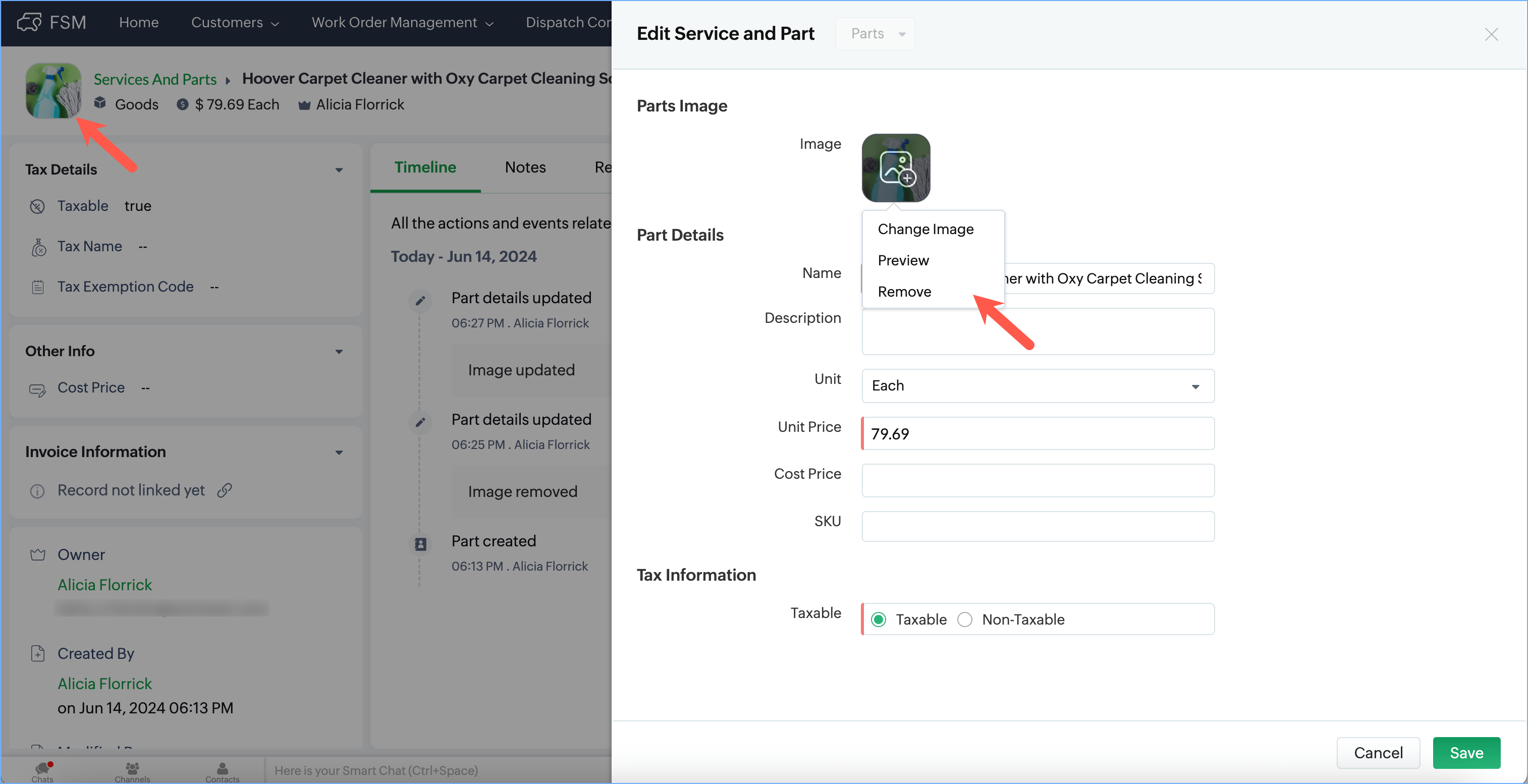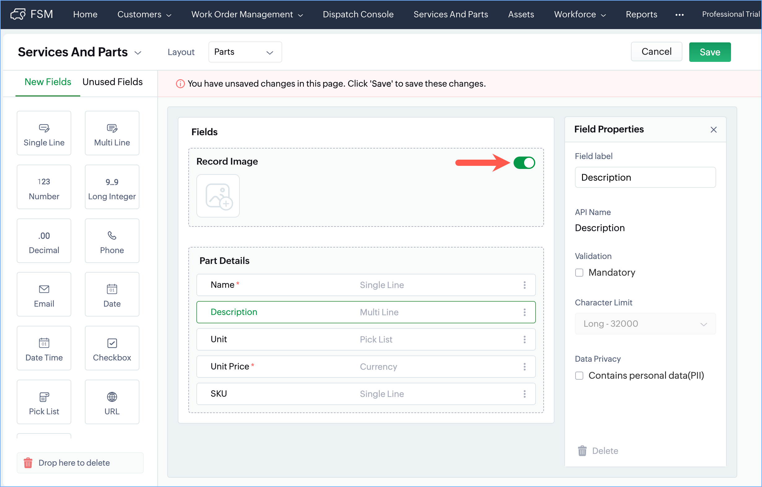 To an Asset, or Service/Part record, you can add a record image. This can help users quickly identify the correct part or asset in the field. In order to add the record image, this field needs to be enabled for the module from the Module Builder. You can upload images in the file format .jpg, and .png with a maximum size of 5MB.