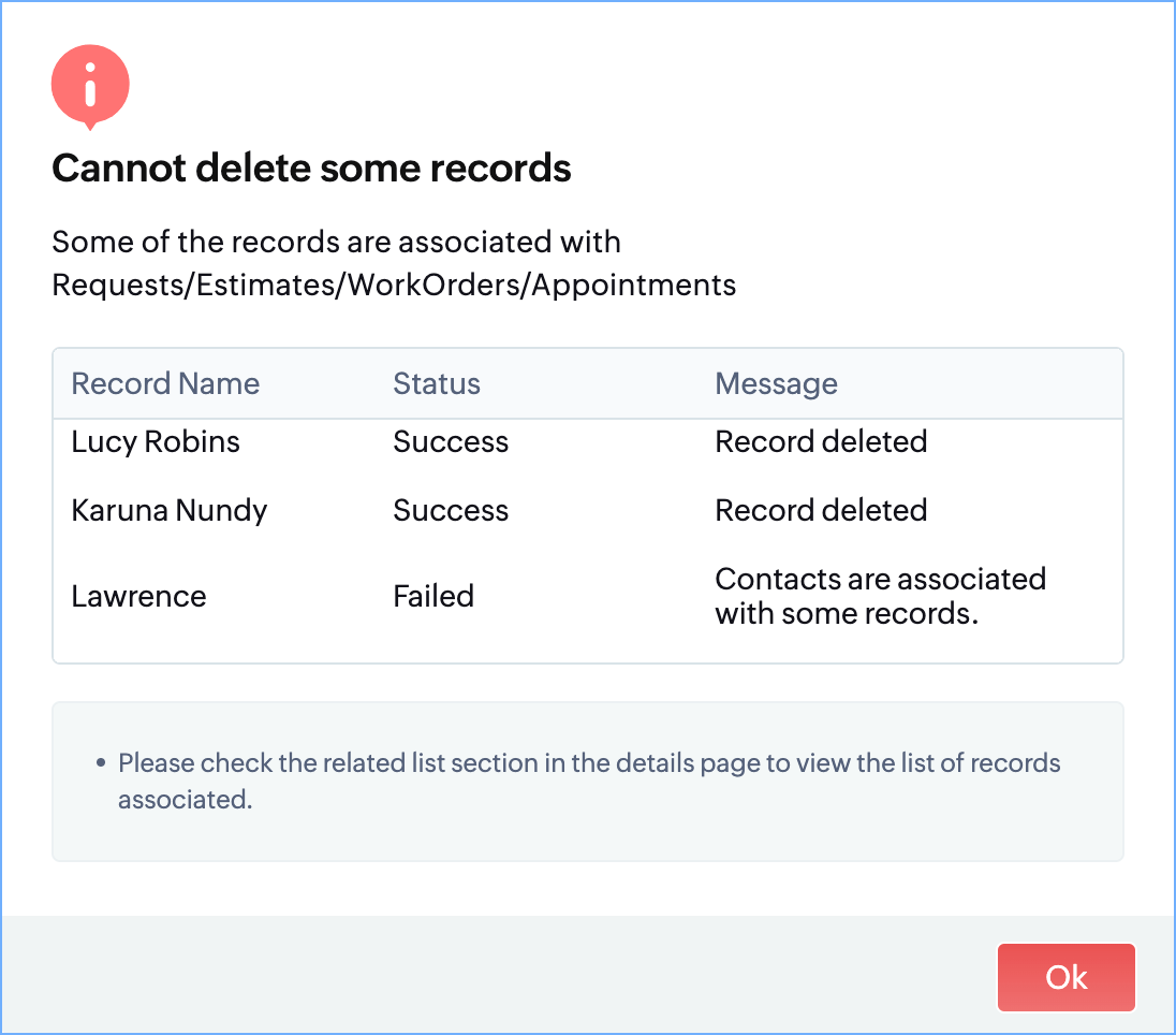 If there are records associated with the records you are trying to delete, then these records will not be deleted. The details of whether the selected records have been deleted or not will be listed.