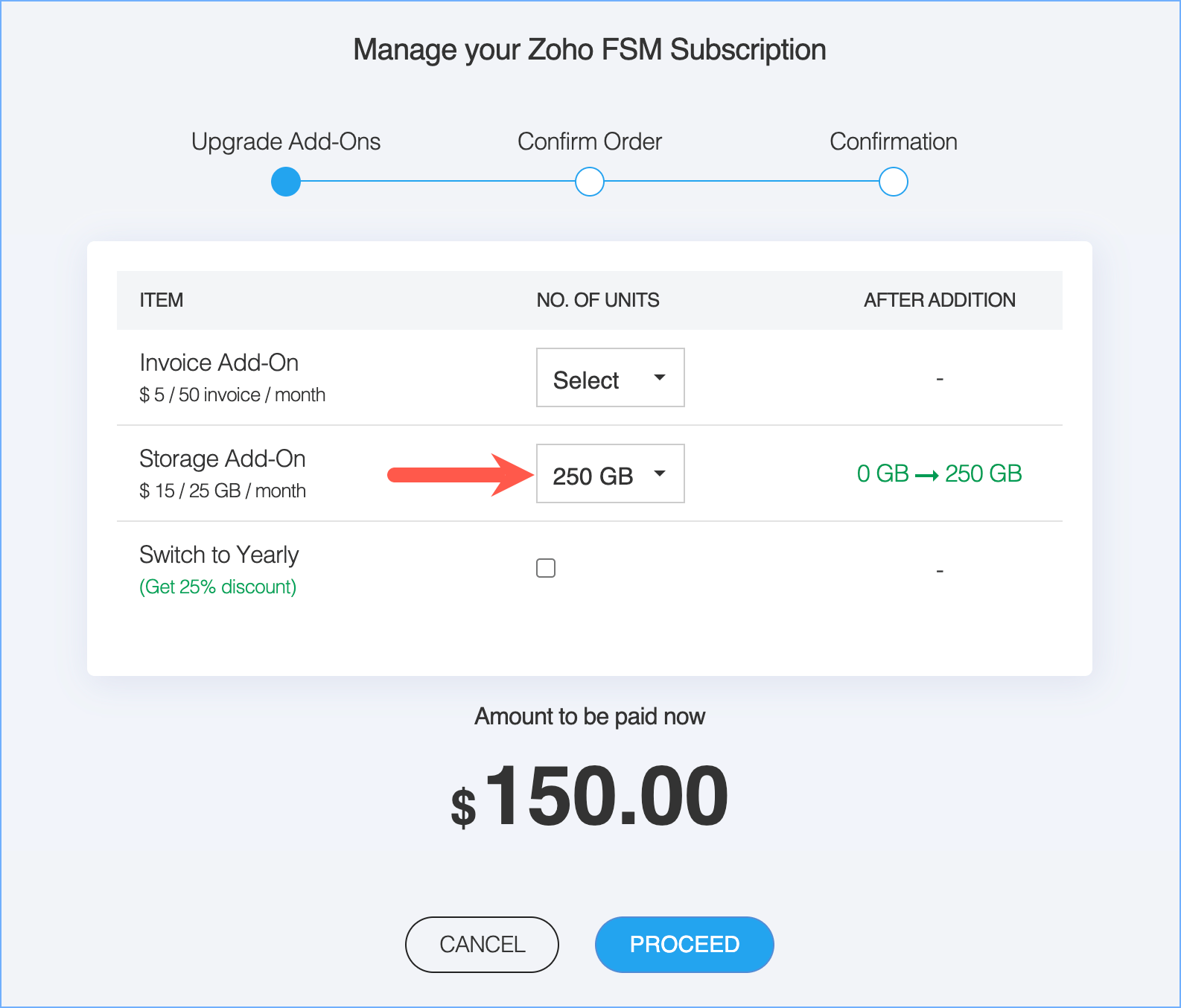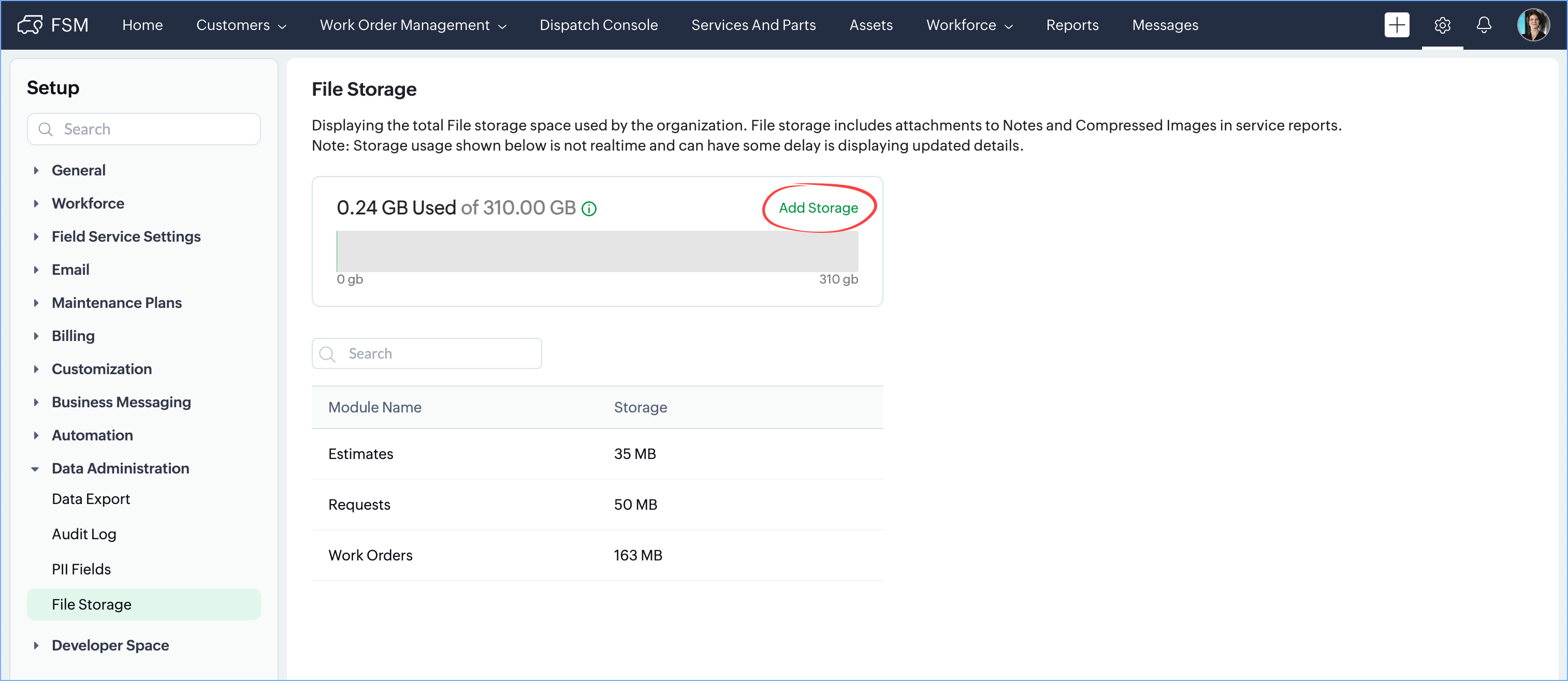 The purchased storage will also be shown in Zoho FSM. Hover over the