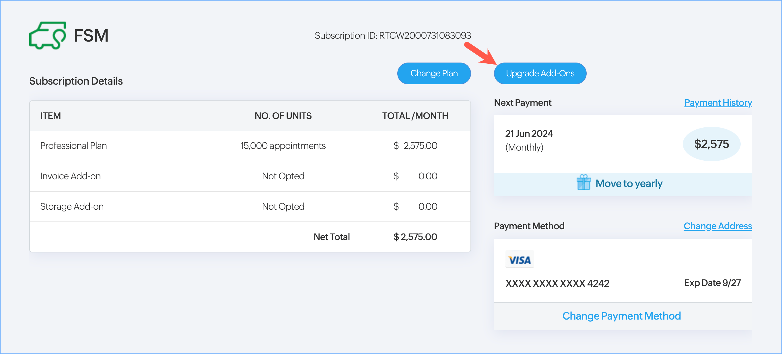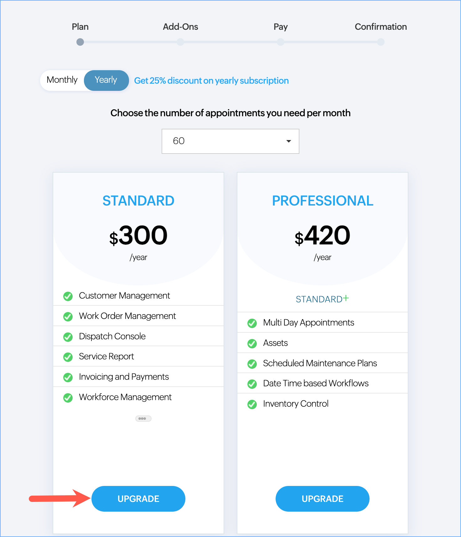 If you are in the Free edition, you will first need to upgrade as you cannot purchase storage add-on in the Free edition. Choose the edition, the number of appointments, renewal cycle, etc as per your requirements and click Upgrade.