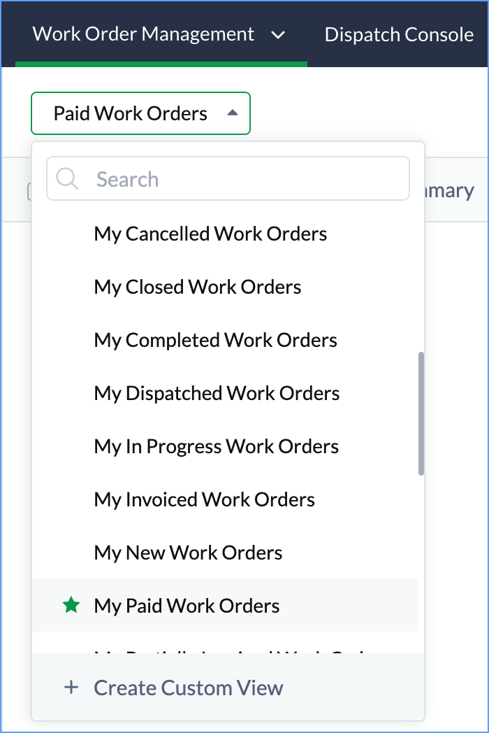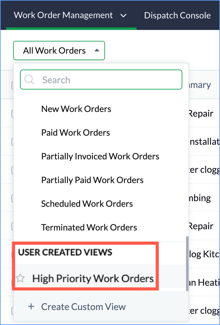 Default or FSM List Views are system-defined views that have records based on predefined filters. E.g. Invoiced Work Orders, My Contacts, Dispatched Service Appointments, etc.