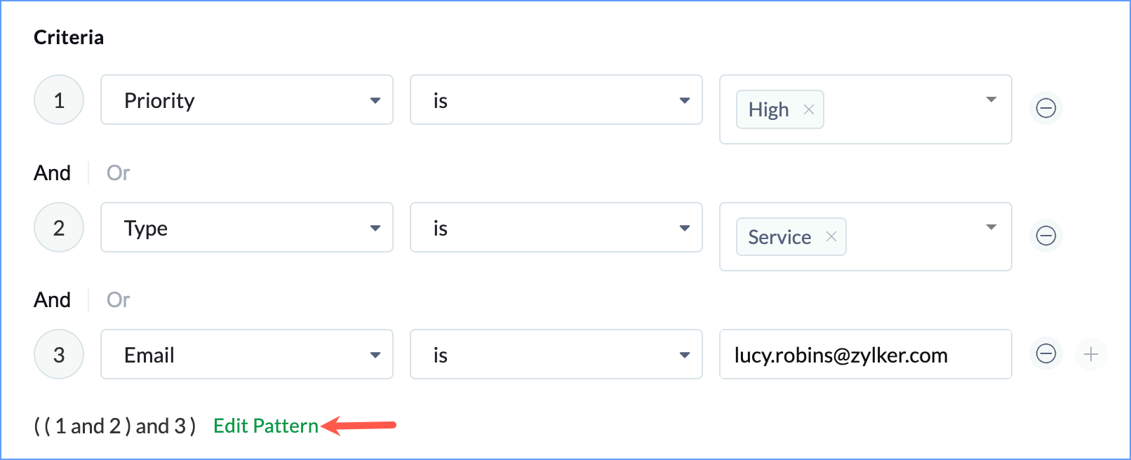 Click + or - to add or remove a filter criteria. You can add a maximum of five criteria. Click Edit Pattern to make changes to the criteria and click Save.