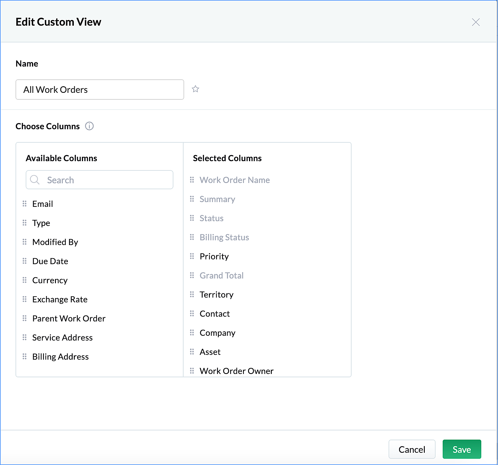 4. The system-defined columns will however be greyed out and cannot be deleted or reordered.