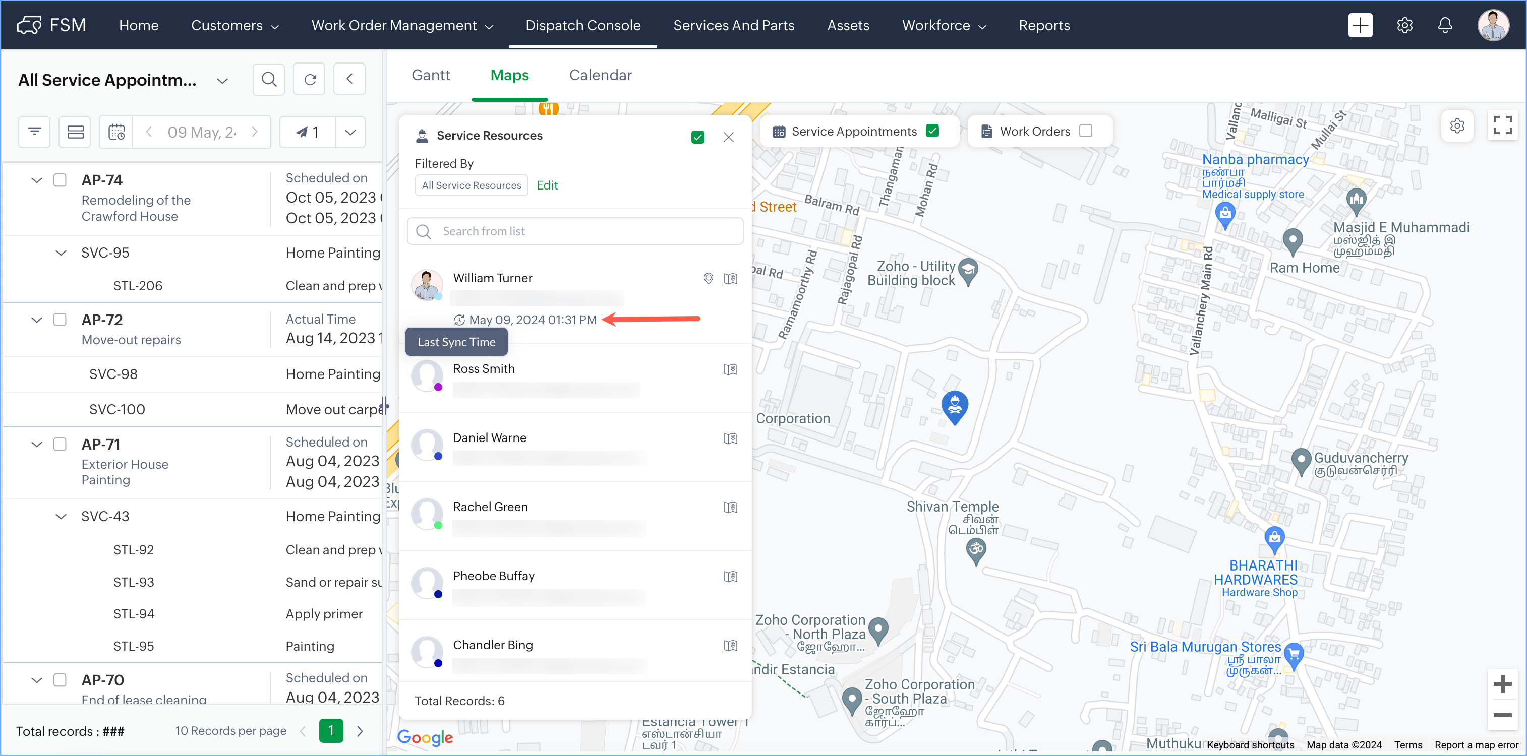 In Zoho FSM you can track the GPS location of the field agents. Knowing the location of the field agents will help in assigning the appointments to the agent closest to the service location. The location of the field agents will be visible in the Maps view of the Dispatch Console in the Zoho FSM web app.