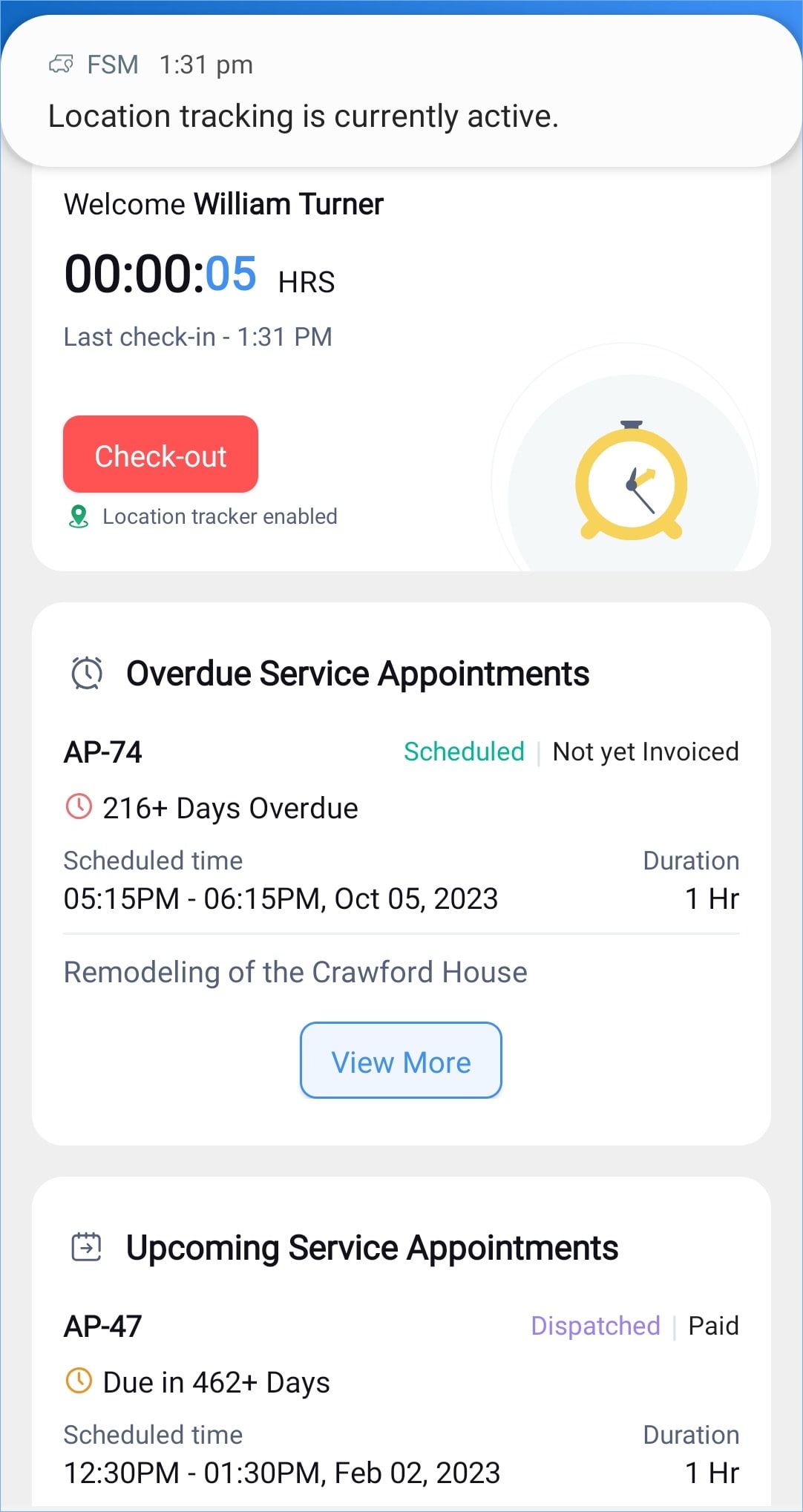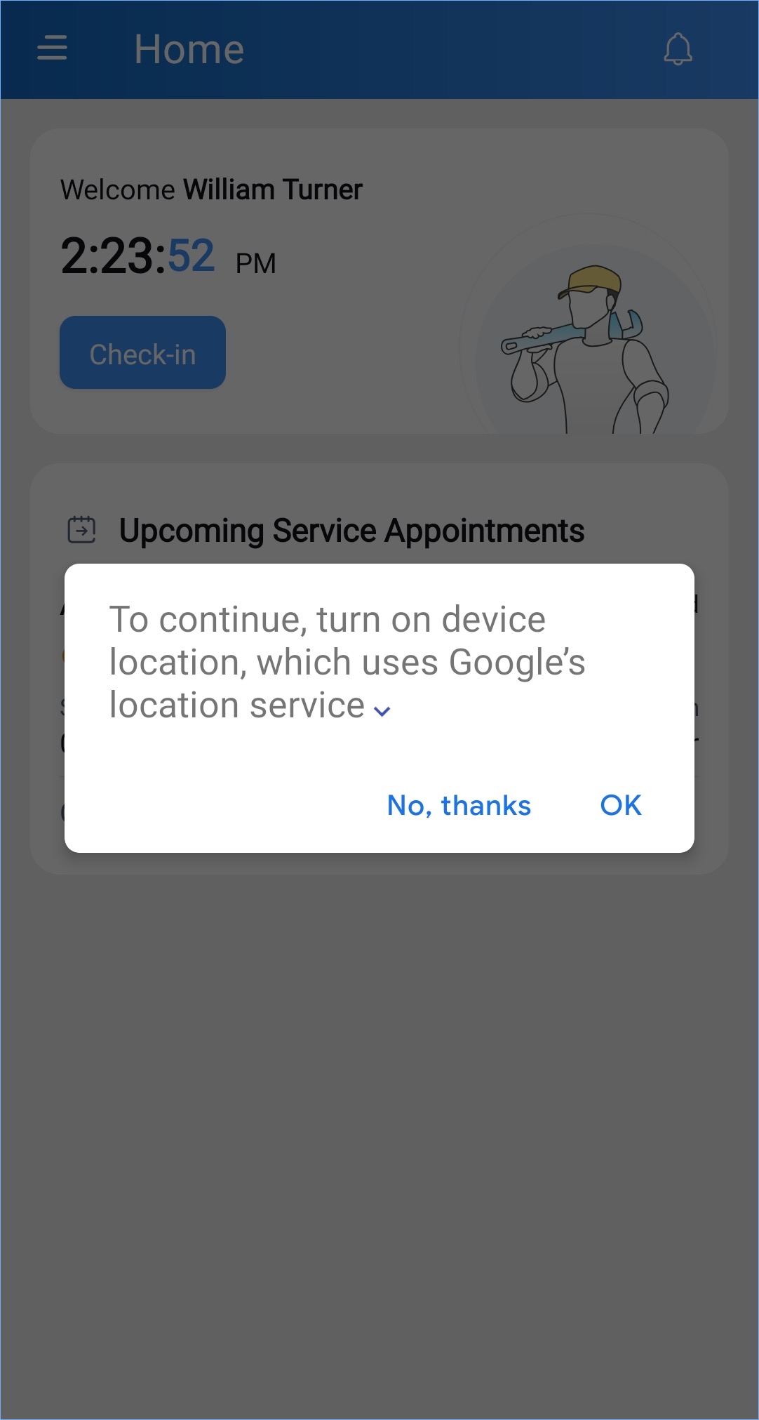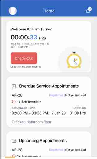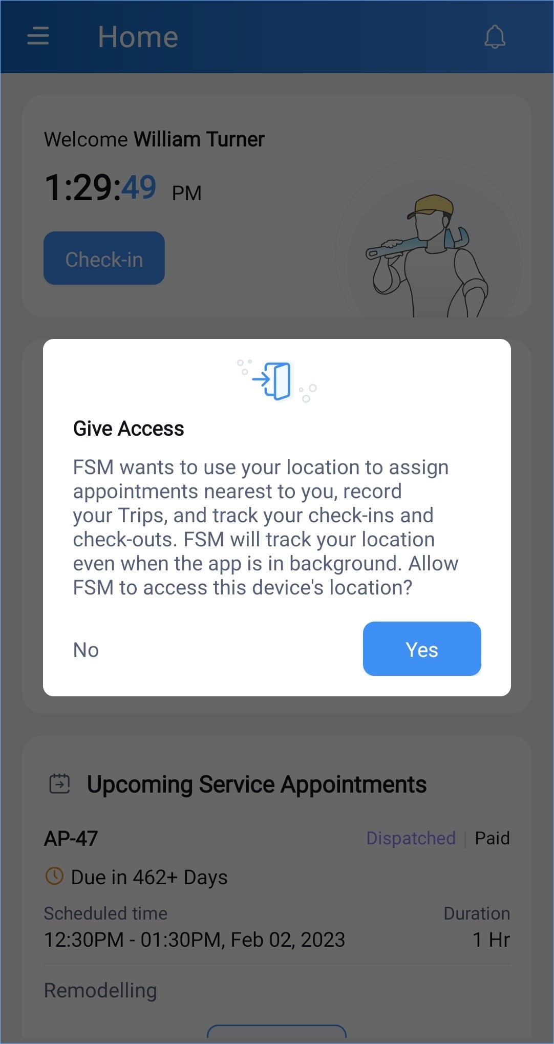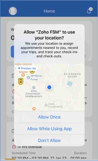 When the field agent checks-in to the Zoho FSM mobile app, the location tracking will be enabled. Follow the steps below to enable location tracking in the FSM mobile app: