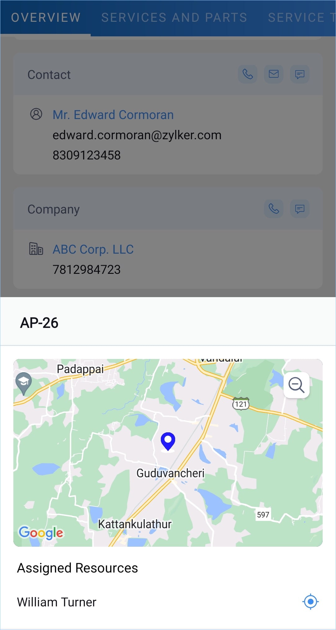 The location tracking information captured through the mobile app will be used to show the location of the field agents in the Maps view of the Dispatch Console in the Zoho FSM web app. This location will be updated every 15 seconds. In the Maps view of the Dispatch Console, the field agent's last known location will be indicated by this icon - . The details (if present) of the time when the location information was last updated will be displayed under the service resource's name and email address.