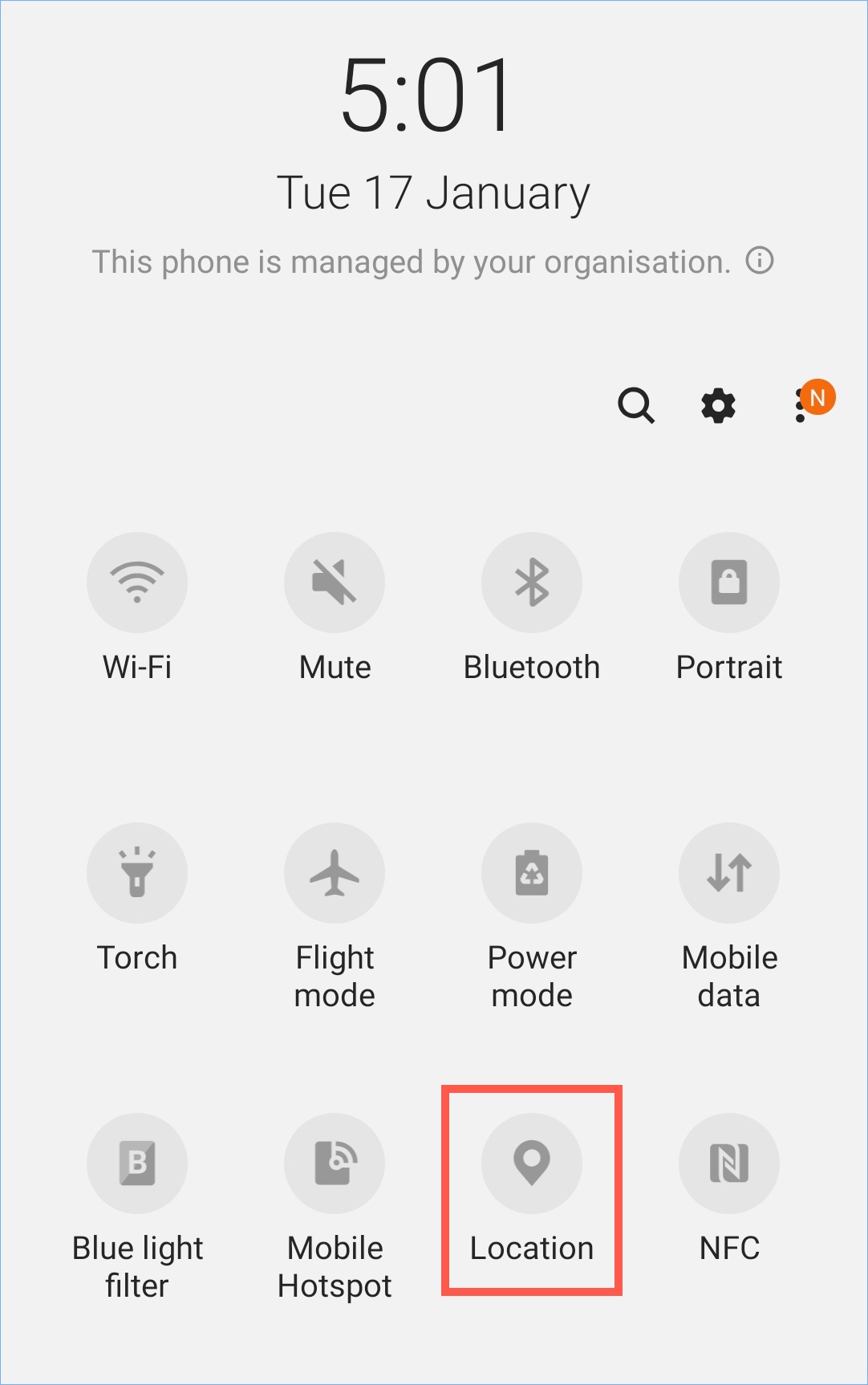 1. The location permission is disabled in your FSM app. To enable the location permission, in your app navigate to Settings > Permission settings > Permissions and enable the Location permission.