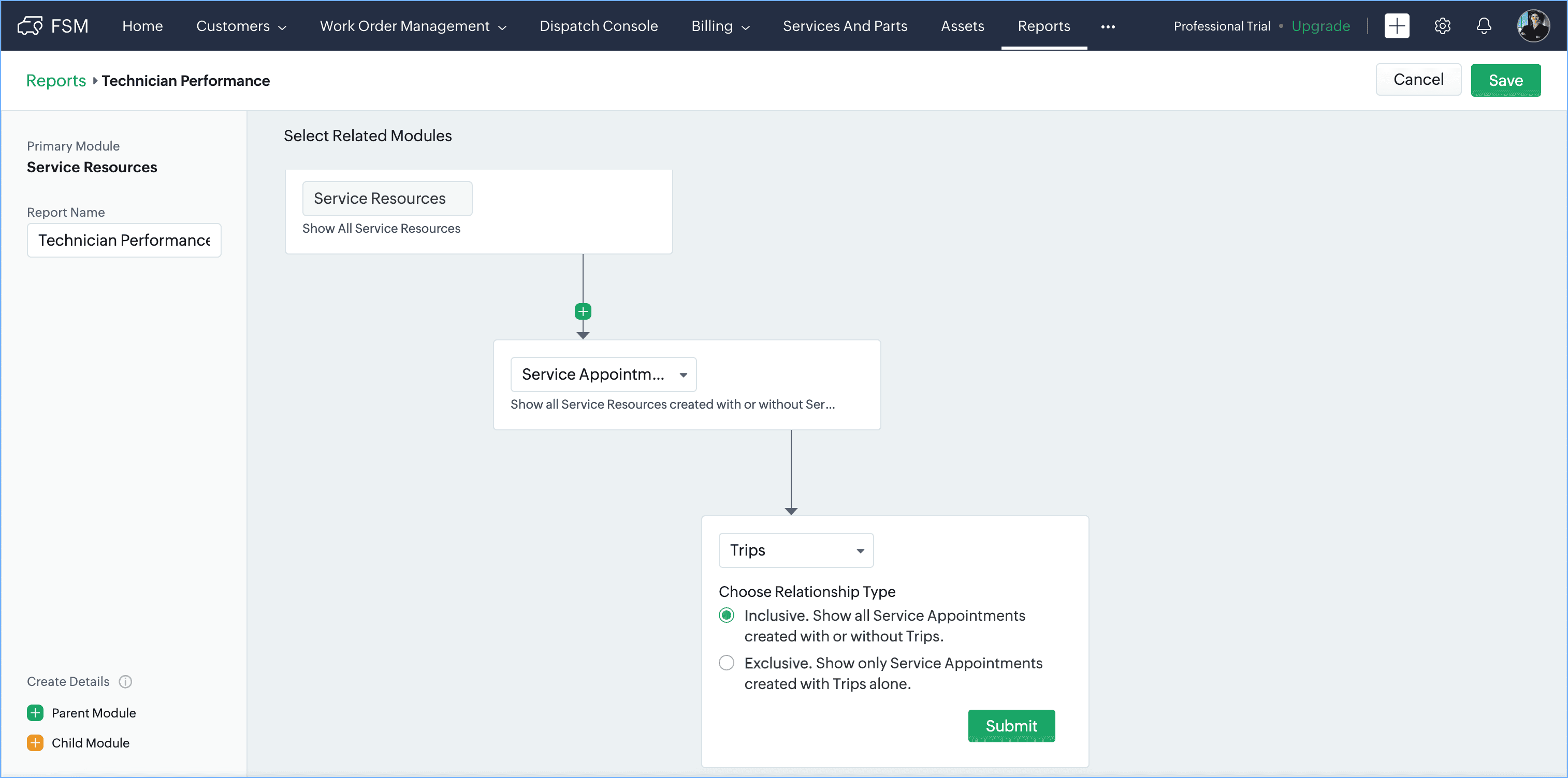 - Add Service Appointments as a Child Module to Service Resources and Trips as the Child Module of Service Appointments. In both these child modules, choose Inclusive as the Relationship Type.