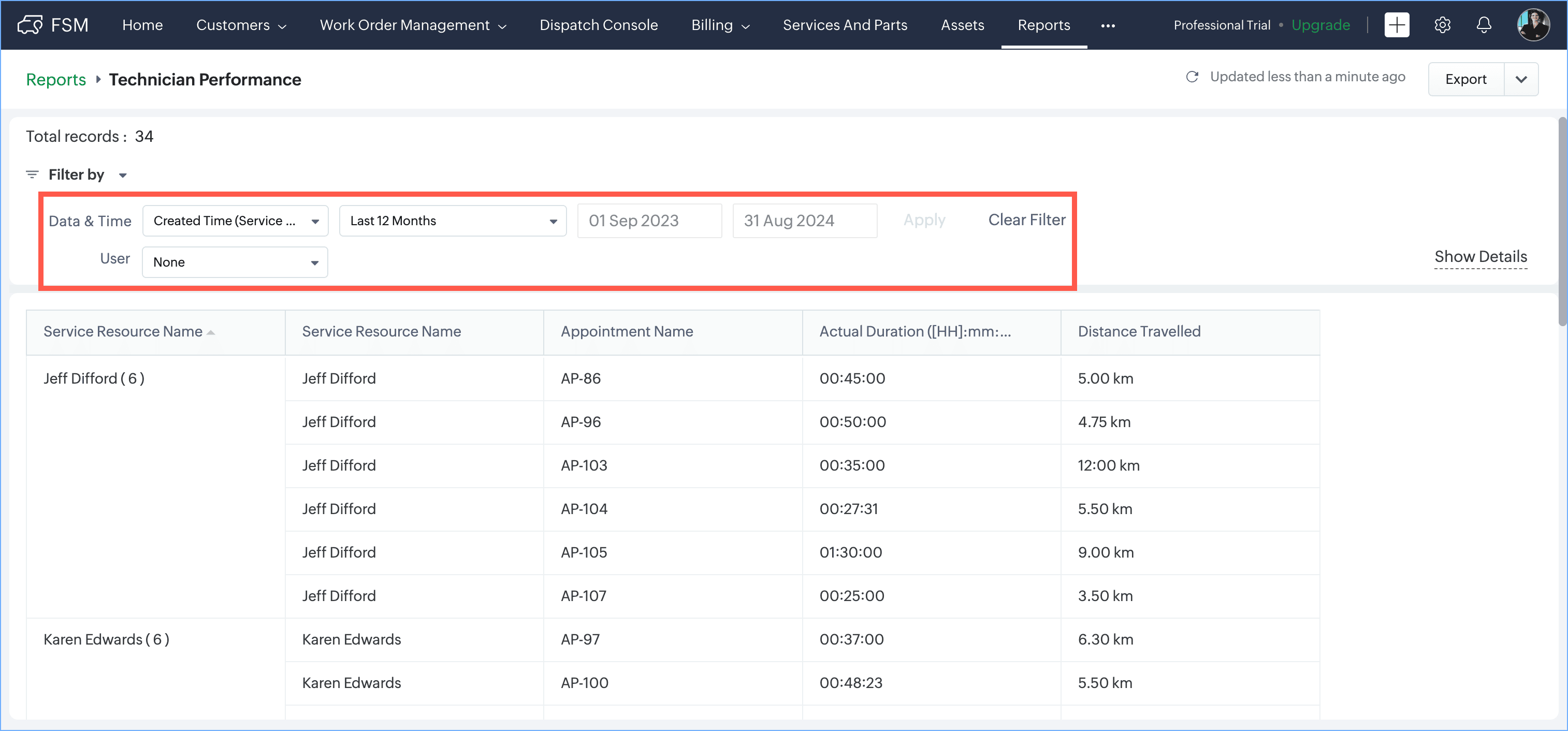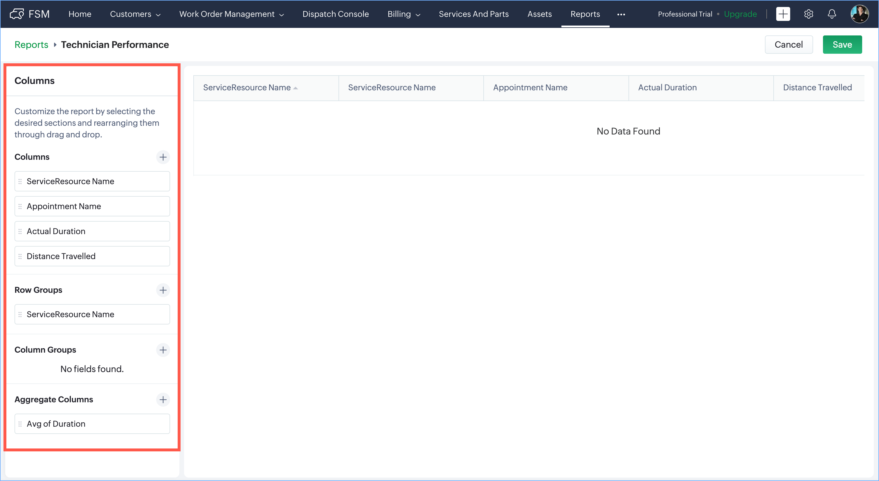 Let's see how we can create a sample custom report called Technician Performance. This report is meant to assess the appointments done by the field agents by evaluating the time it takes to complete an appointment and how long it takes technicians to travel to a job site. To create this report: