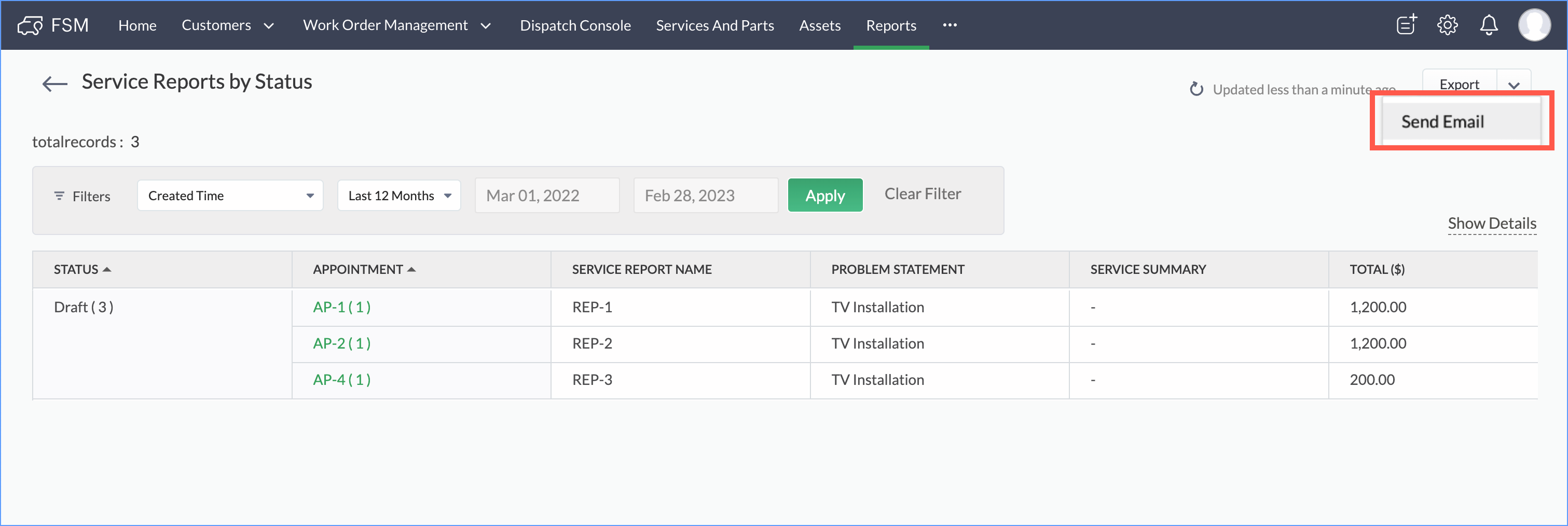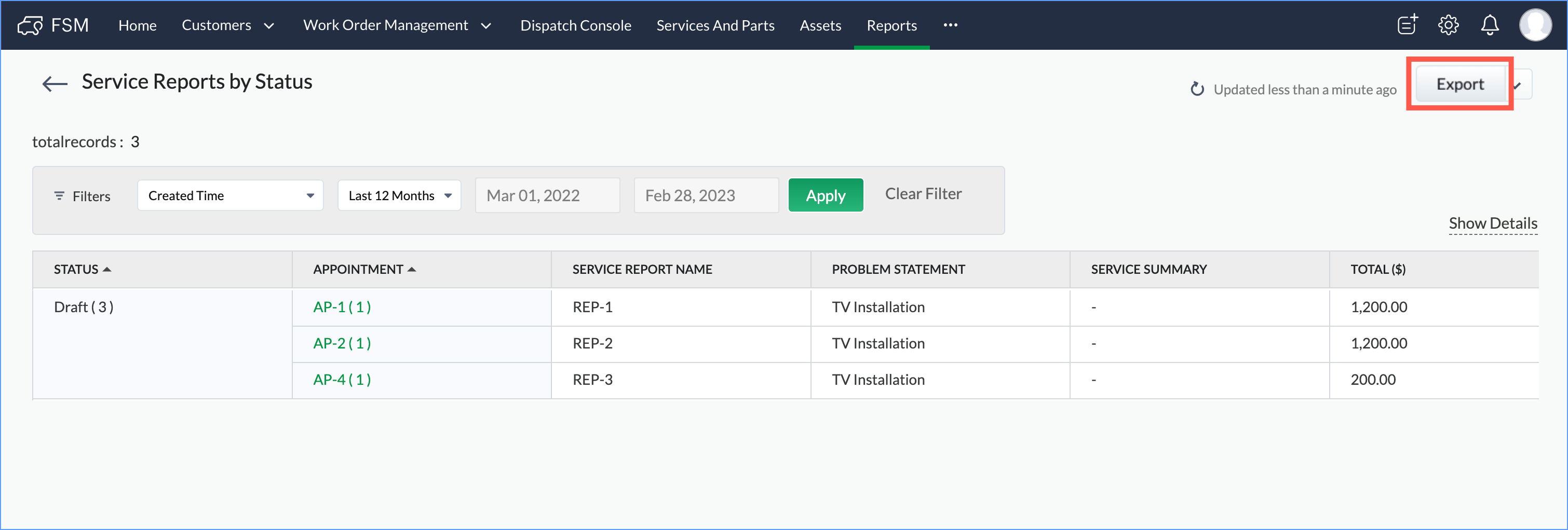 Service Reports by Status | This report categorizes the service reports based on its status, i.e, Draft, Sent |