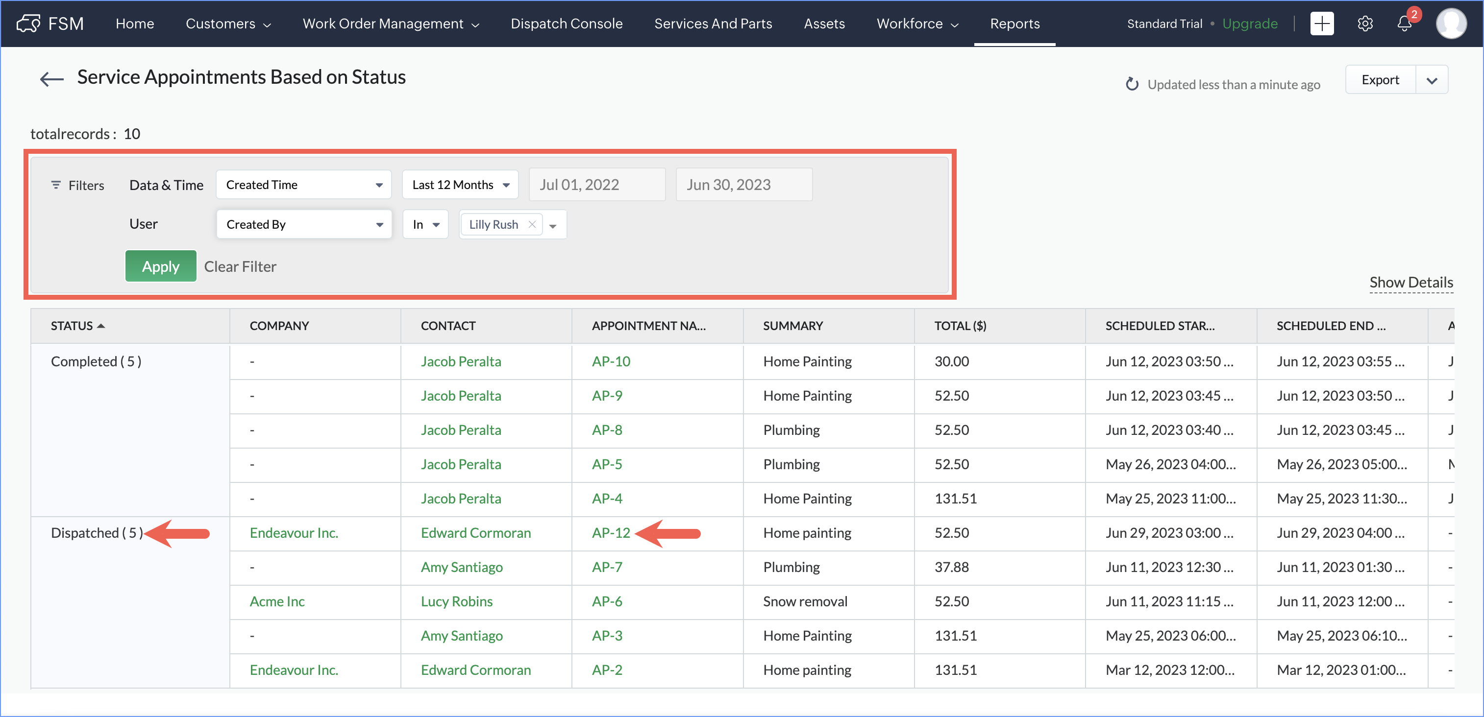 Work Order by Status | This report categorizes the work orders based on its status, i.e New, In Progress, Cannot Complete, Completed, Closed, Cancelled, Scheduled Appointment, and Dispatched |
