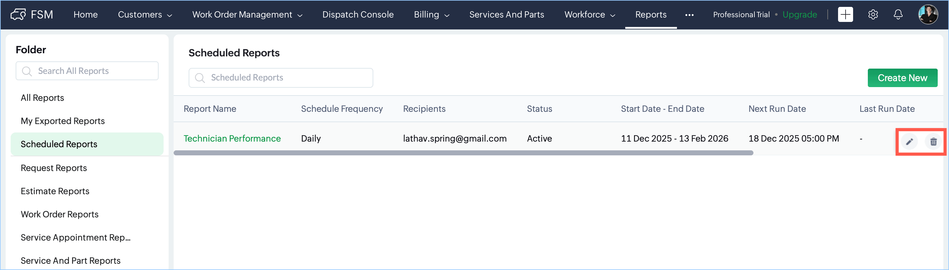 Scheduled Reports help you automate the process of generating and delivering reports at regular intervals—without any manual effort. Instead of repeatedly exporting the same data, you can define a schedule and let Zoho FSM email the reports to you or your team automatically. This ensures timely insights, consistent reporting, and improved visibility across your field service operations.