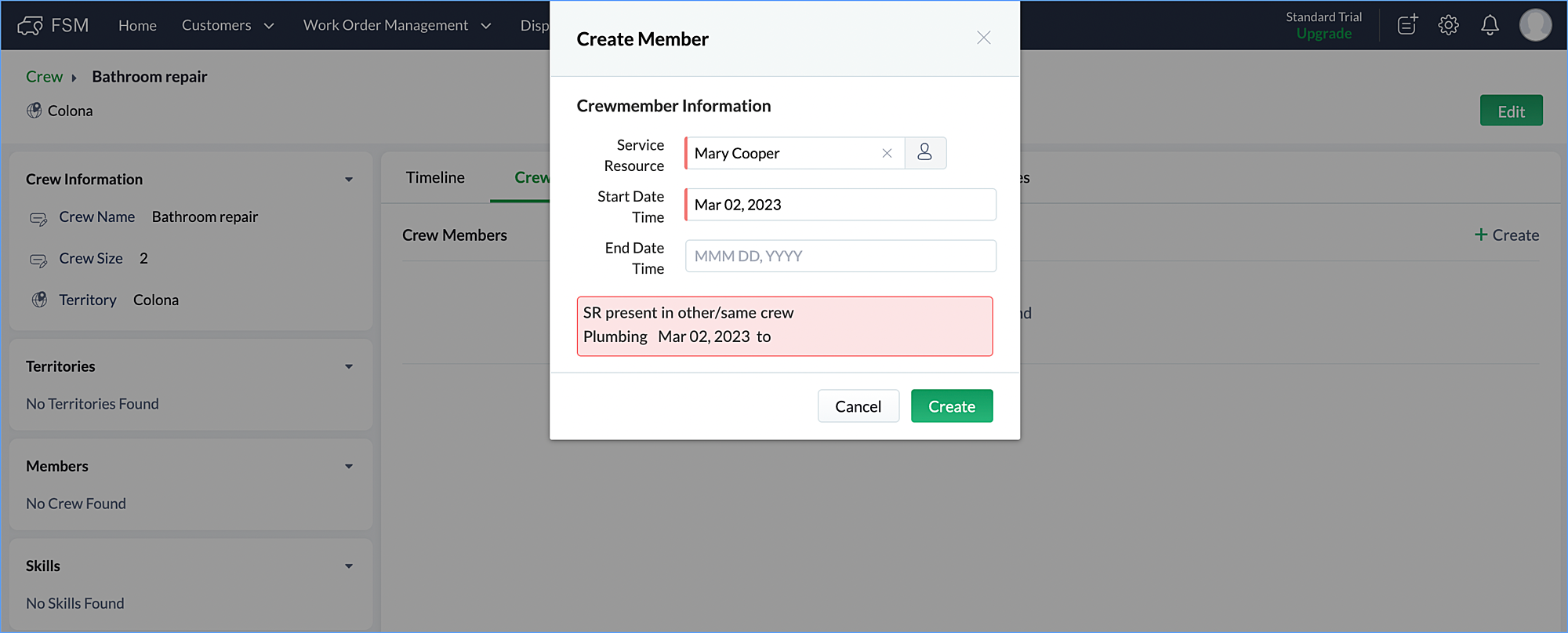To add Crew Members: Go to the Crew Members tab and click + Create. In the Create Member box: Select the Service Resource. Set the Start Date Time and End Date Time. Click Create. The user must be assigned to the same territory as the Crew and for ...