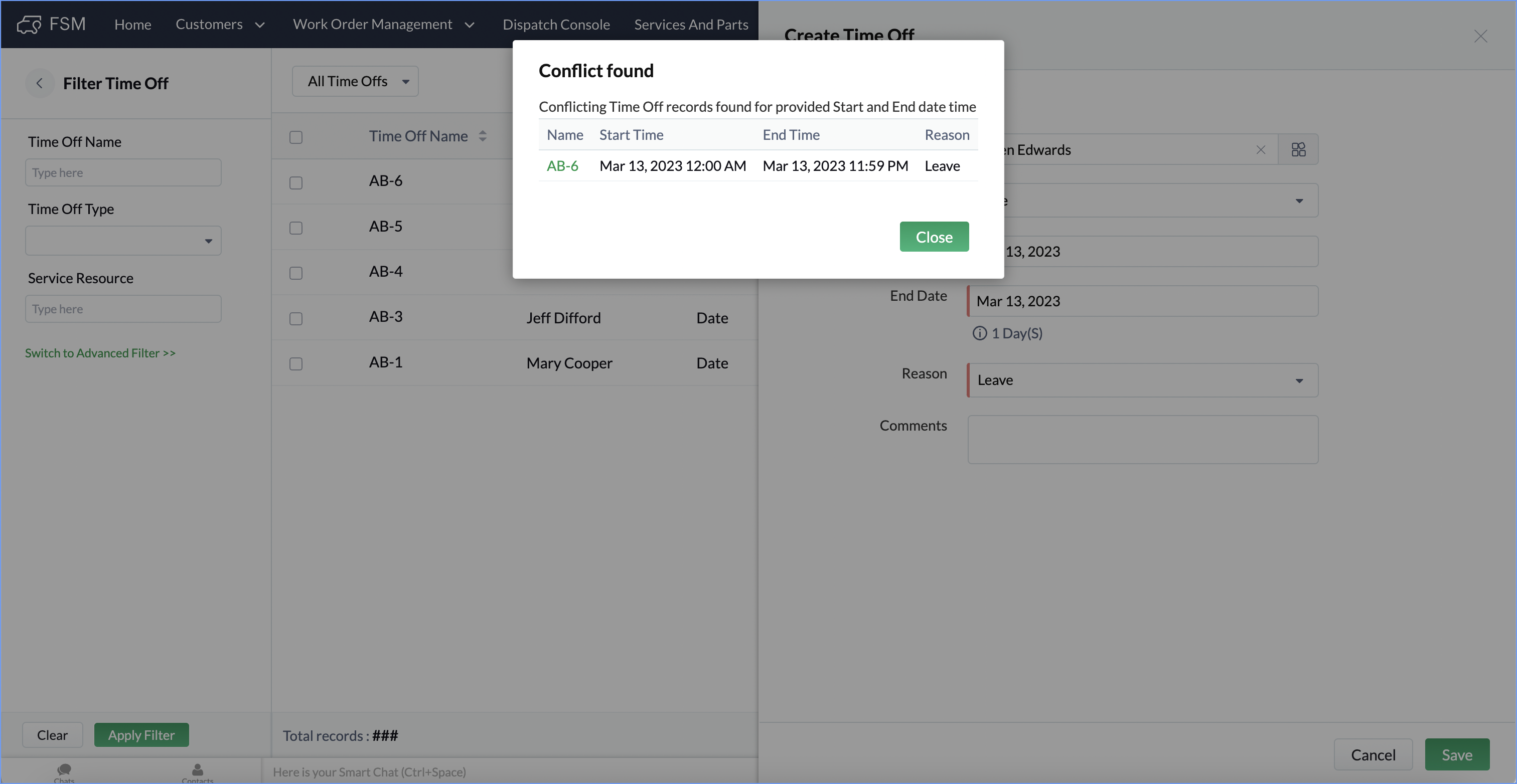 Zoho FSM | Error creating a time off - A time off exists for the service resource at that time