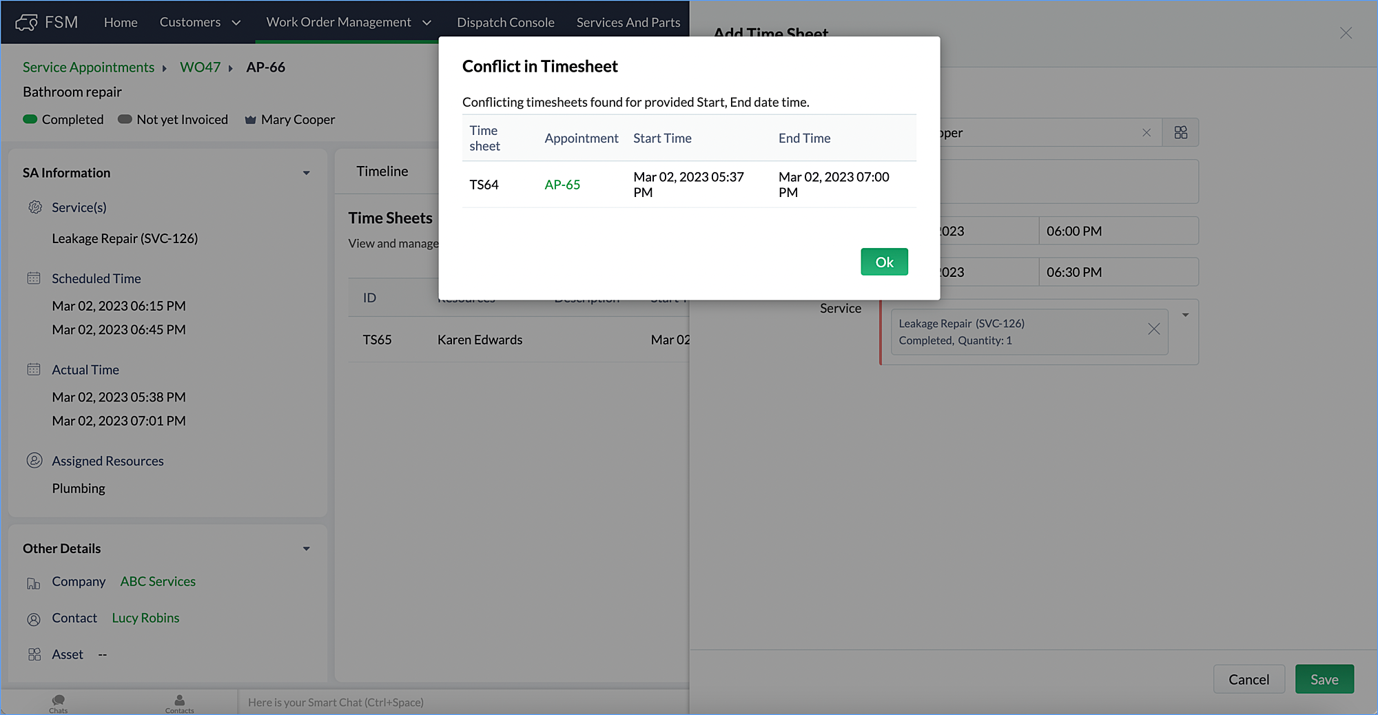 The Start/End Time of the new time sheet you are trying to create for the service resource is in conflict with the Start/End Time of an existing time sheet of the service resource.