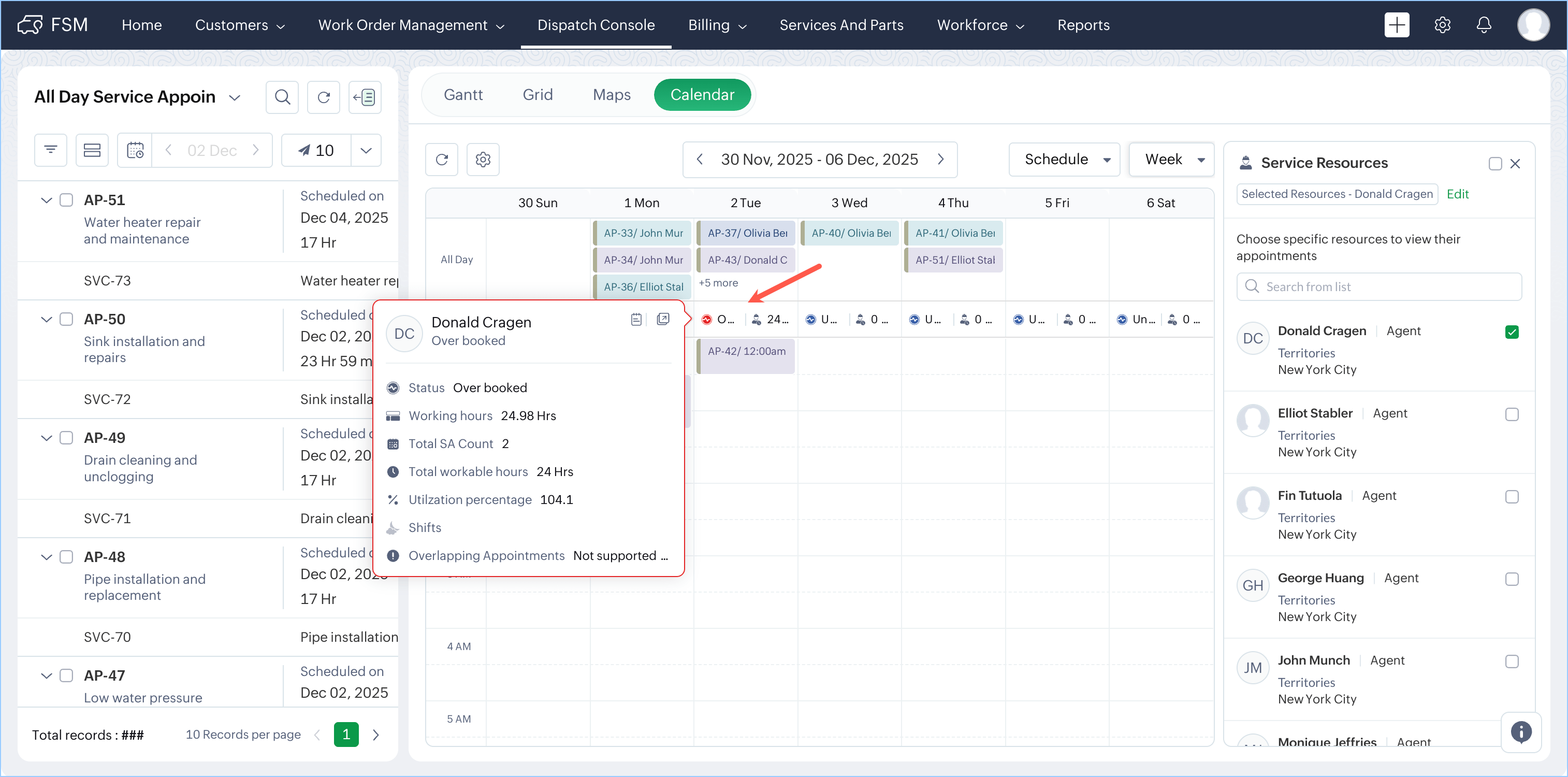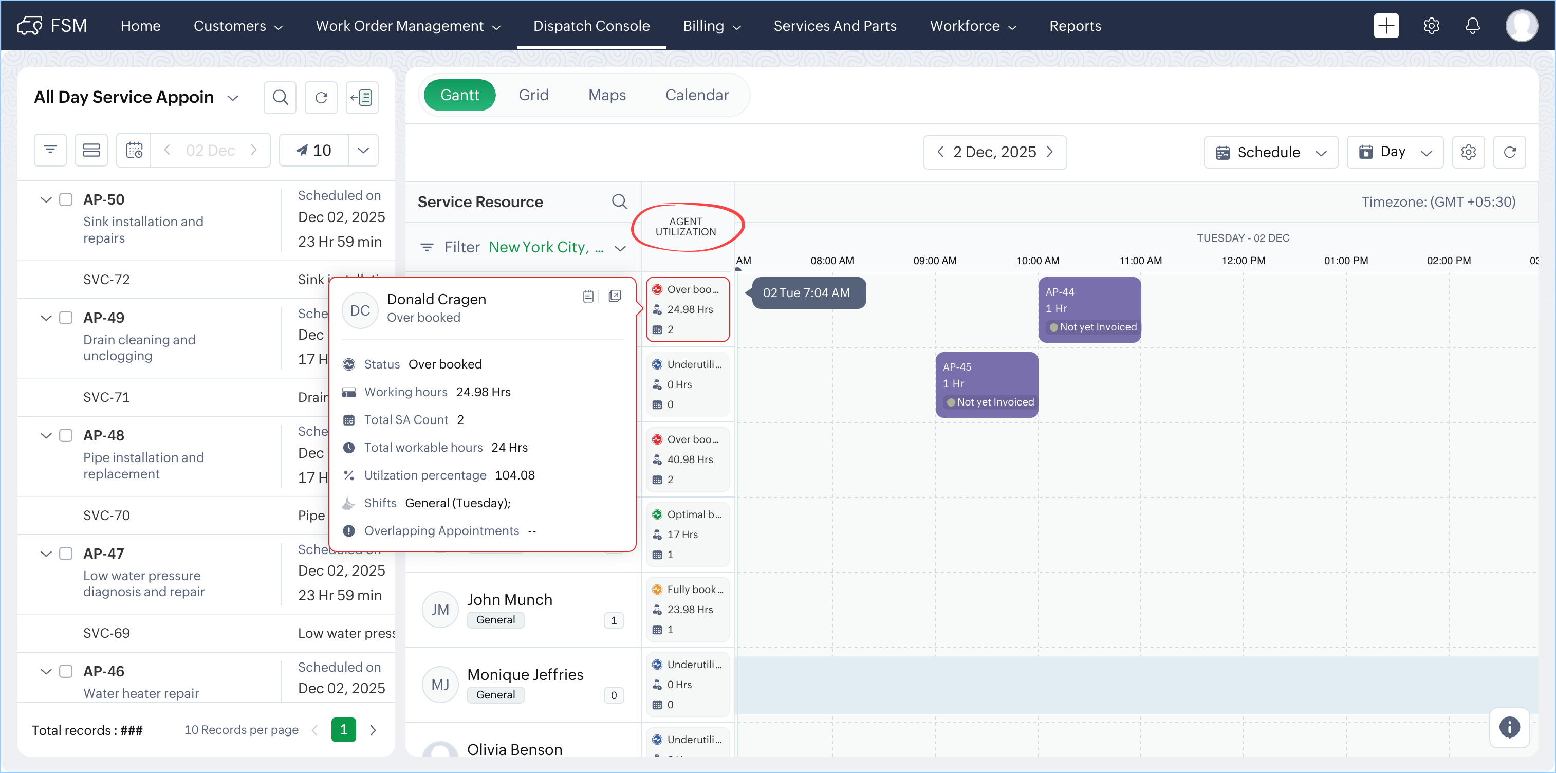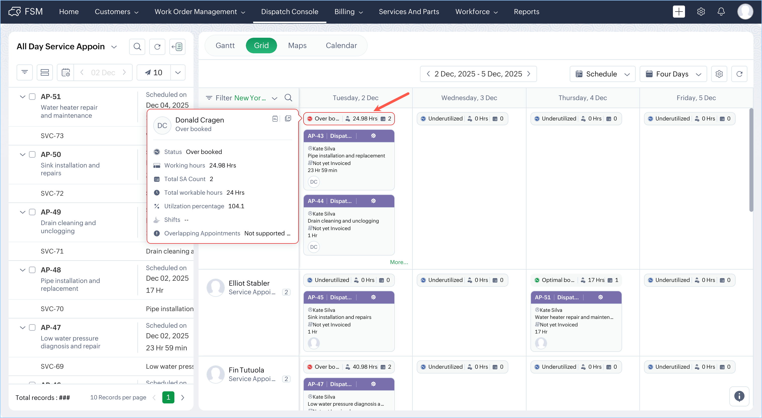 In the Dispatch Console, you can view the utilization levels of your service resources in the Gantt, Grid, and Calendar views. Utilization is categorized into four levels—Overbooked, Fully booked, Optimal booking, and Underutilized.