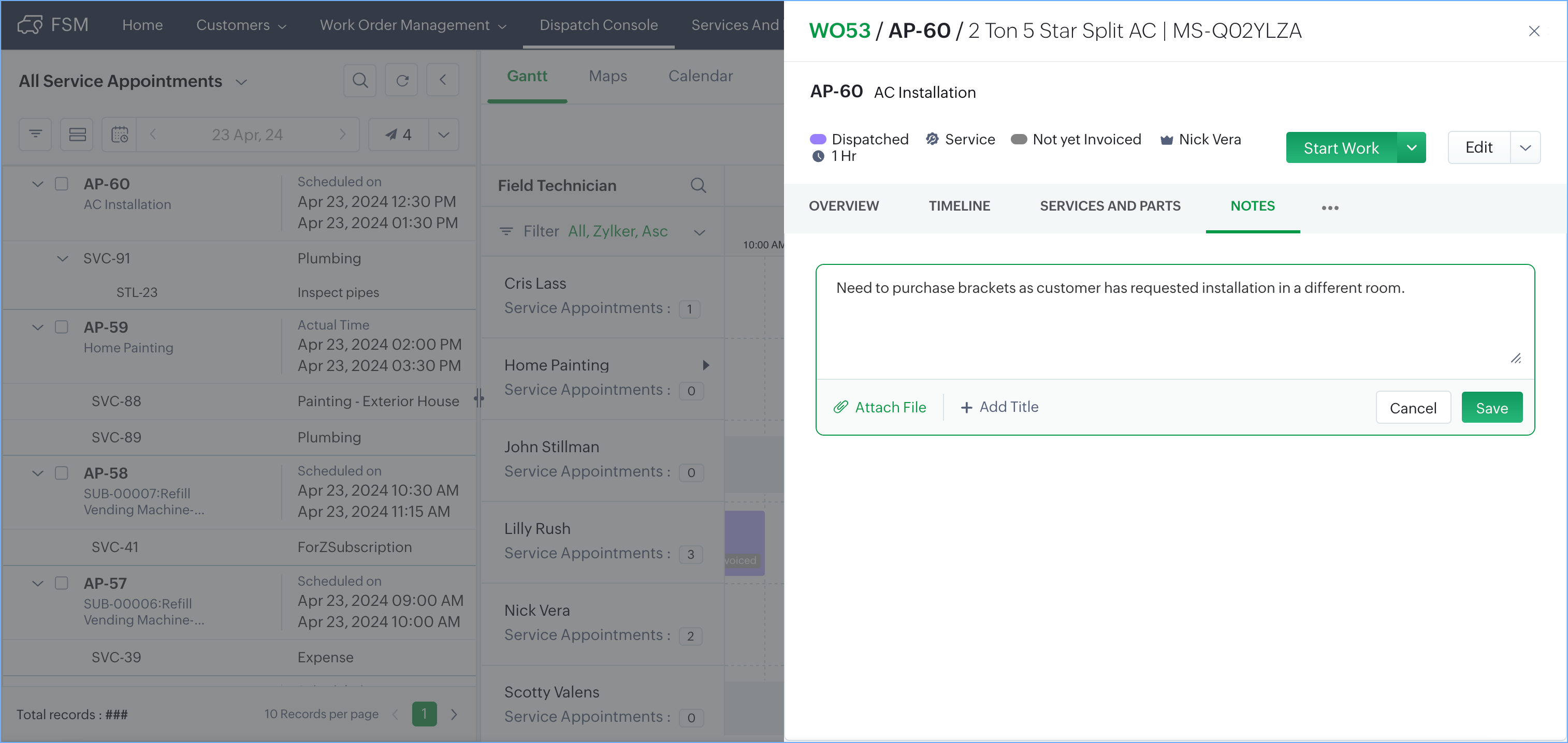 From the Gantt view, you can easily add notes to a service appointment. Click on its service appointment bar and in the popup, click on the Notes link.