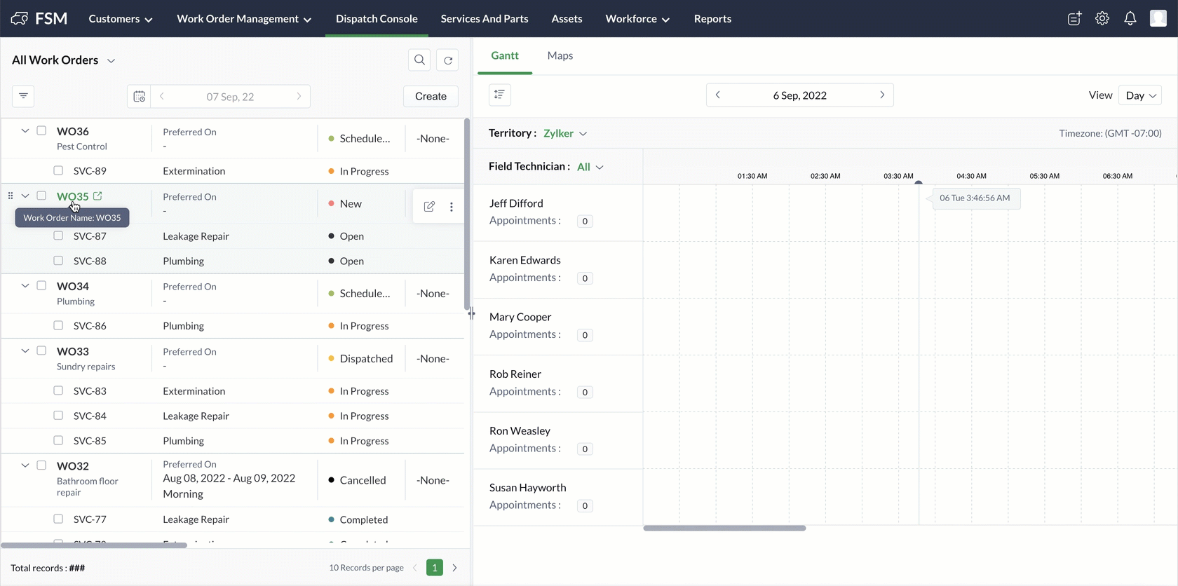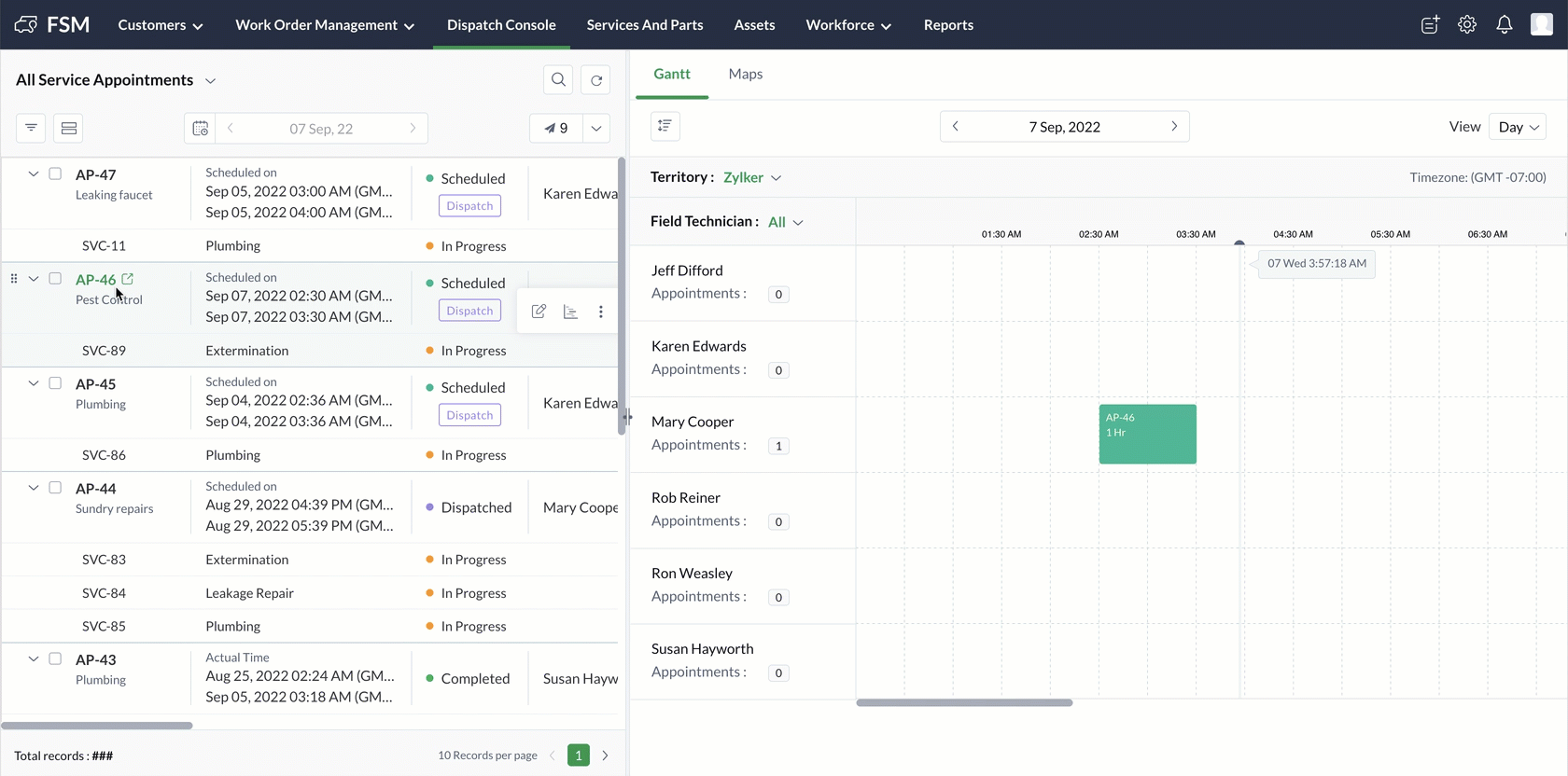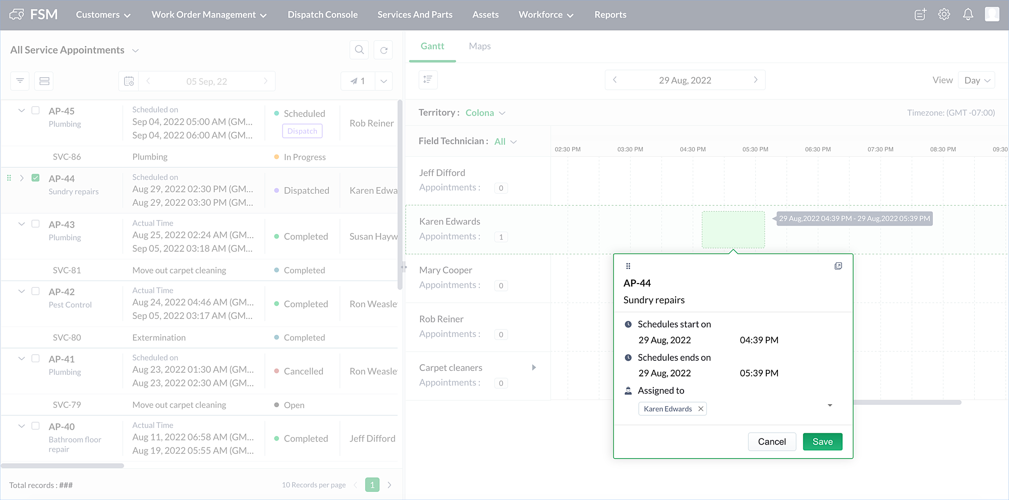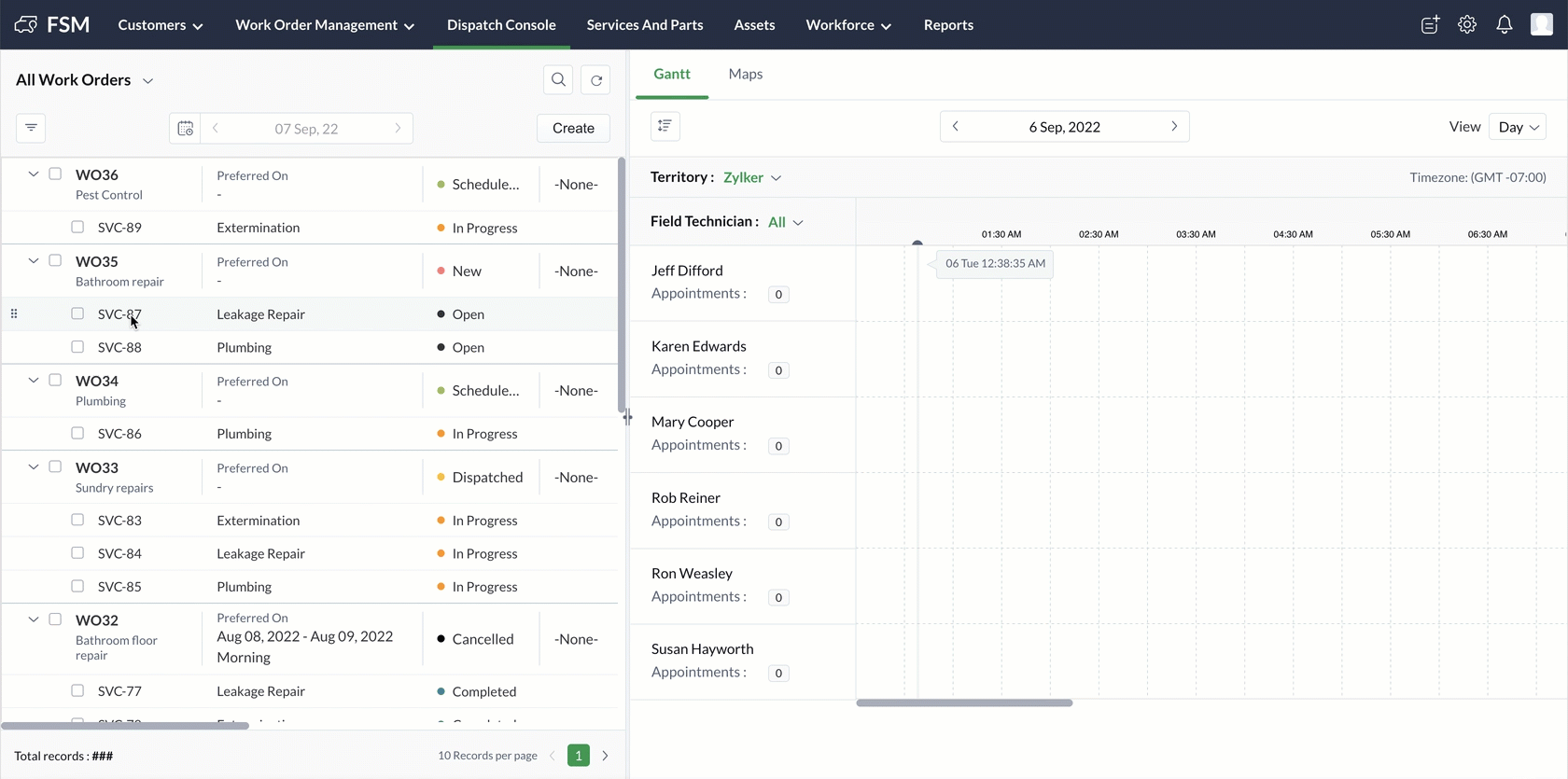 - Drag and drop the work order to the desired point in Gantt that corresponds to the time and agent to which you want to schedule the appointment.