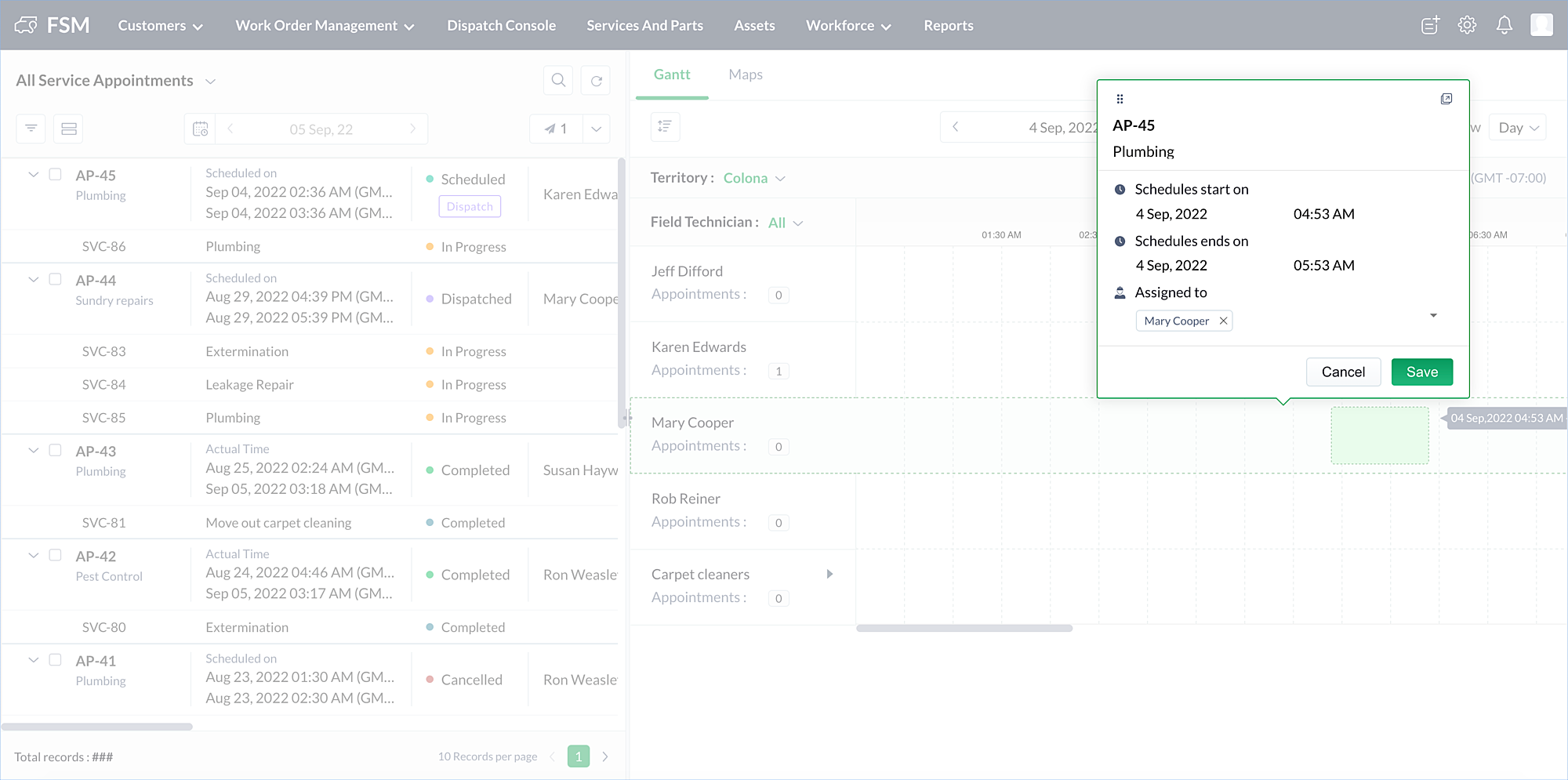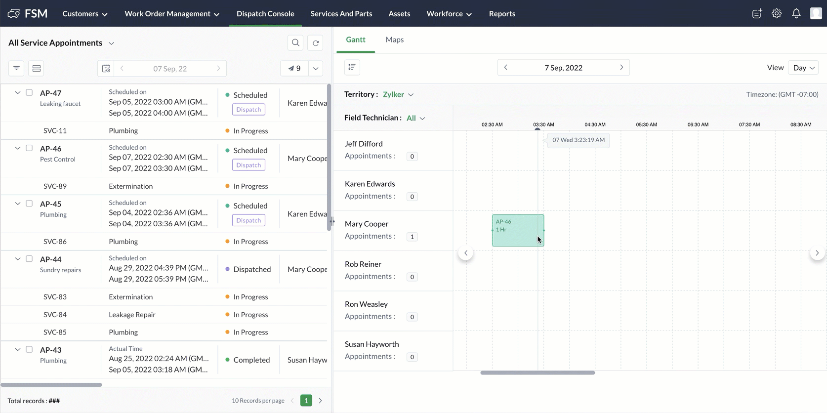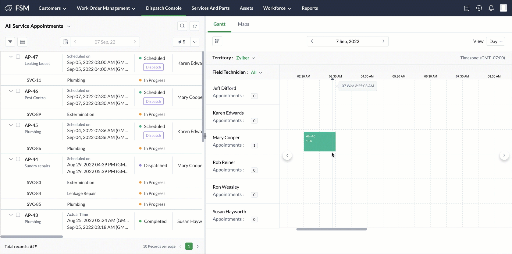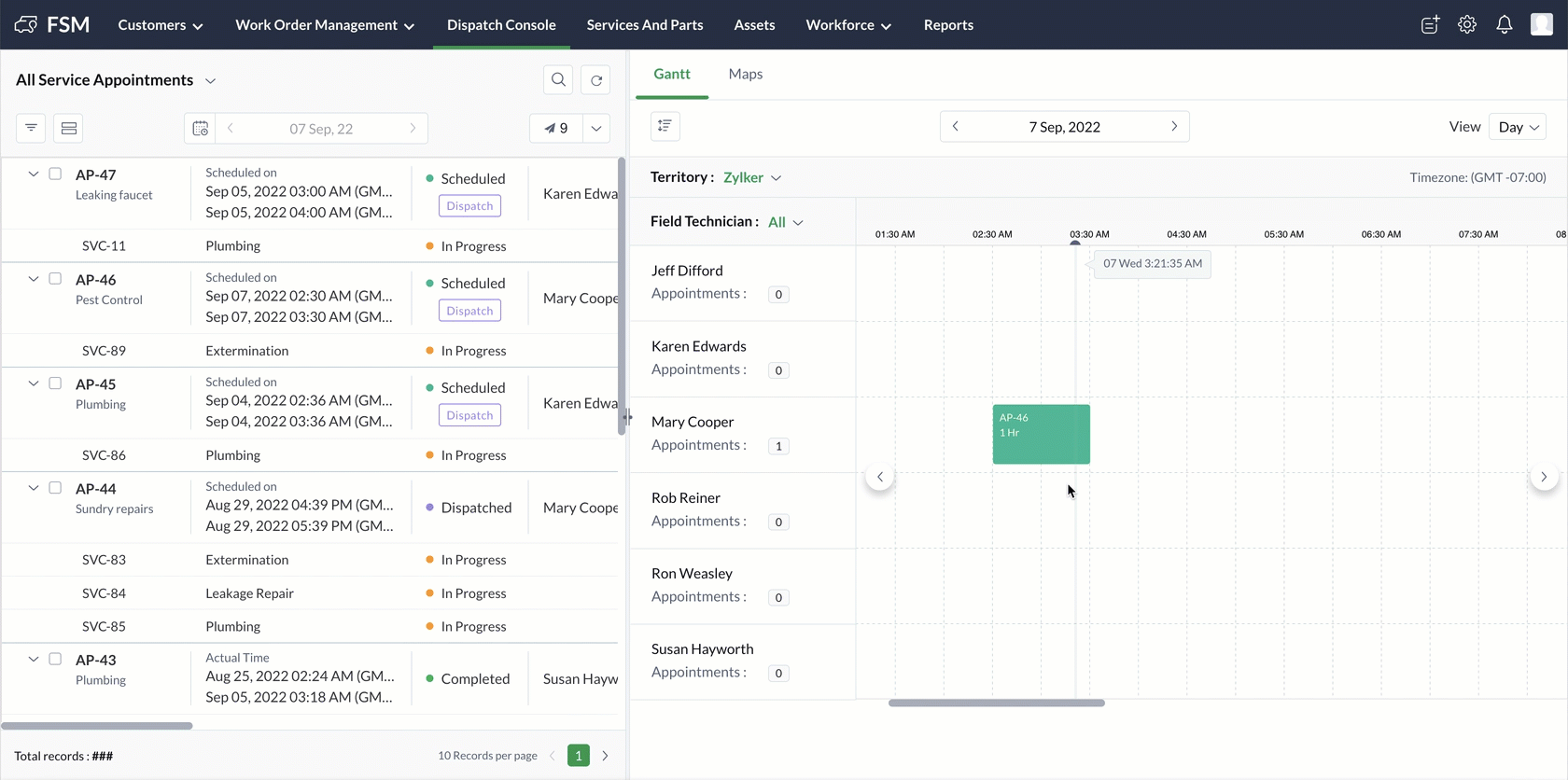 - Drag and drop the work order to the desired point in Gantt that corresponds to the time and agent to which you want to schedule the appointment.