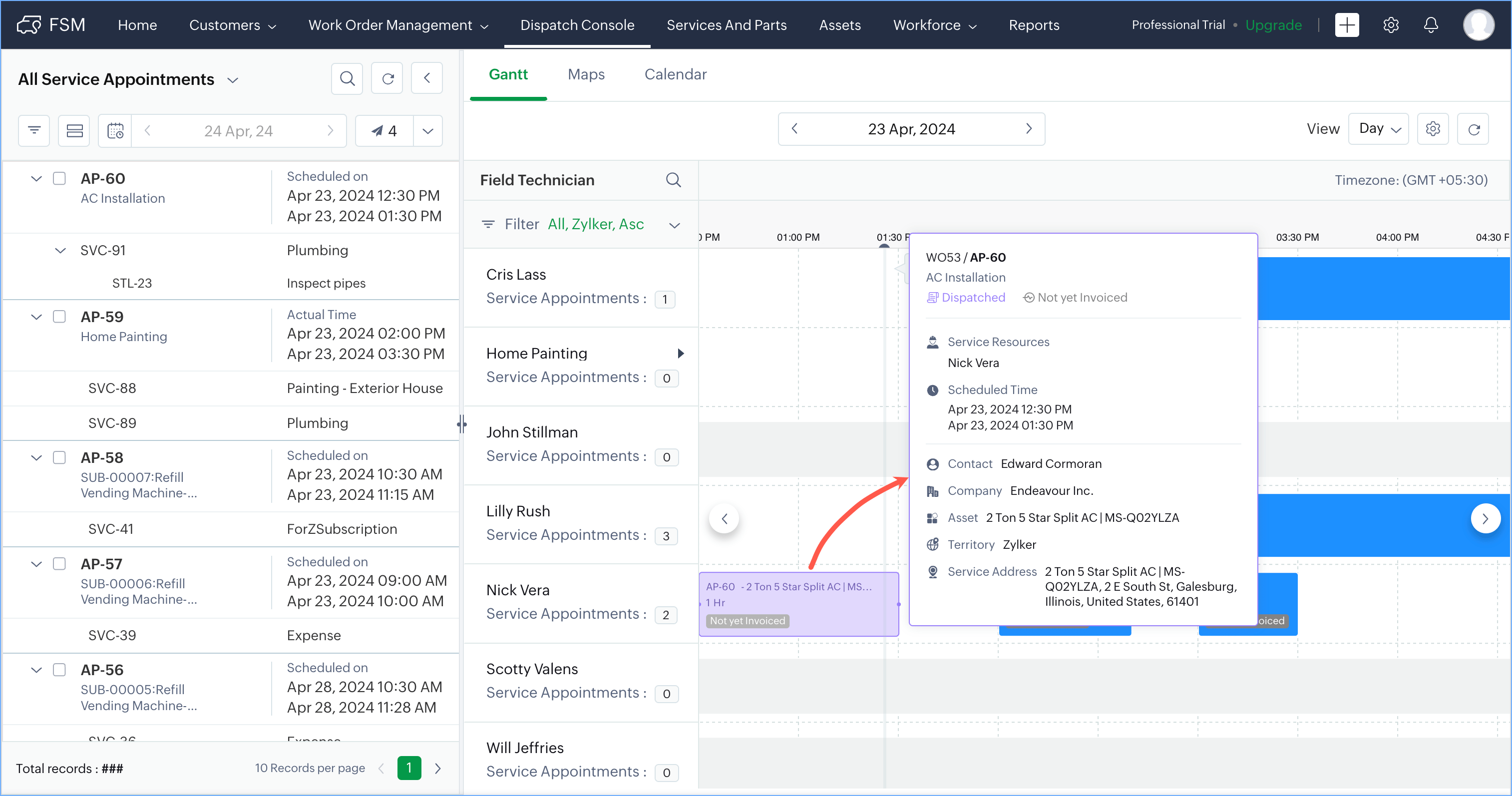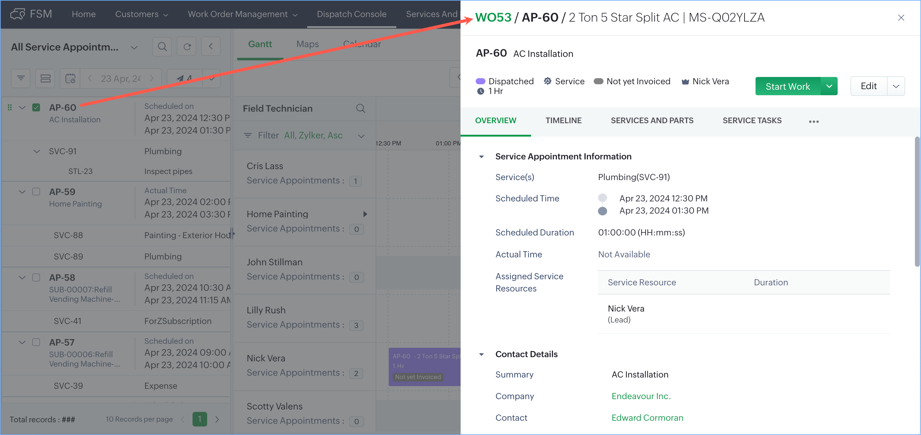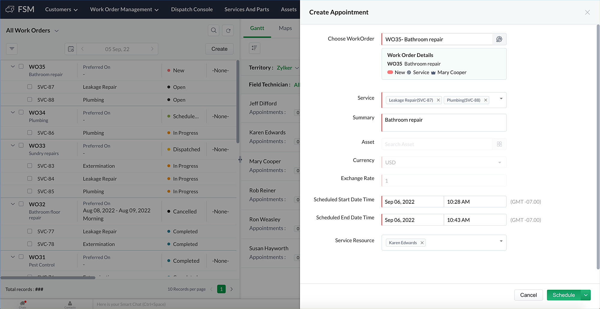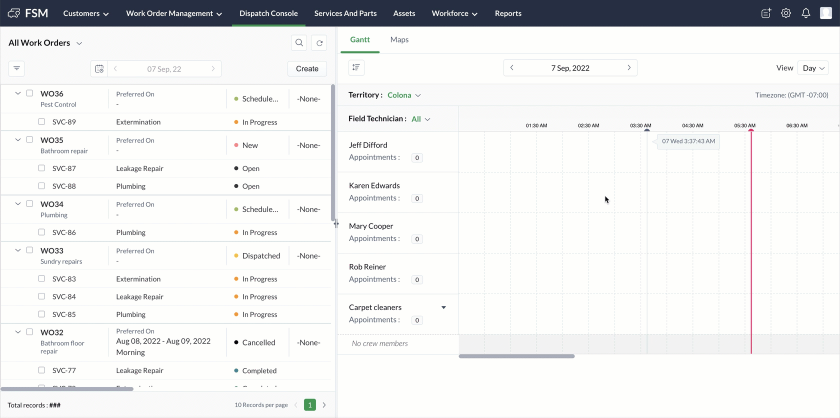 - Drag and drop the work order to the desired point in Gantt that corresponds to the time and agent to which you want to schedule the appointment.