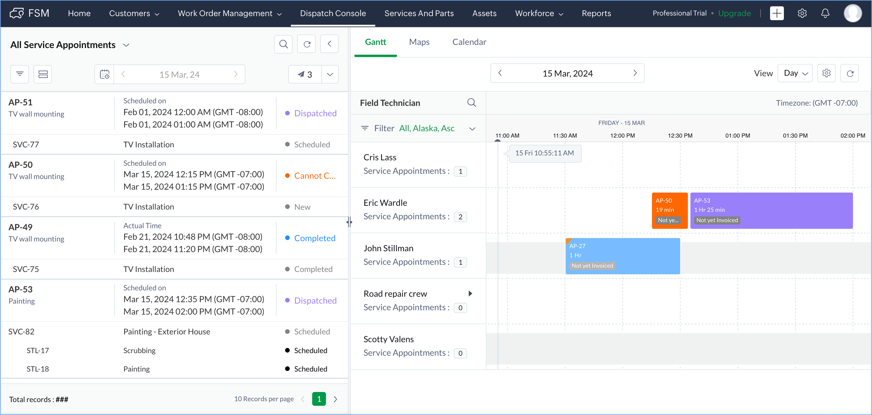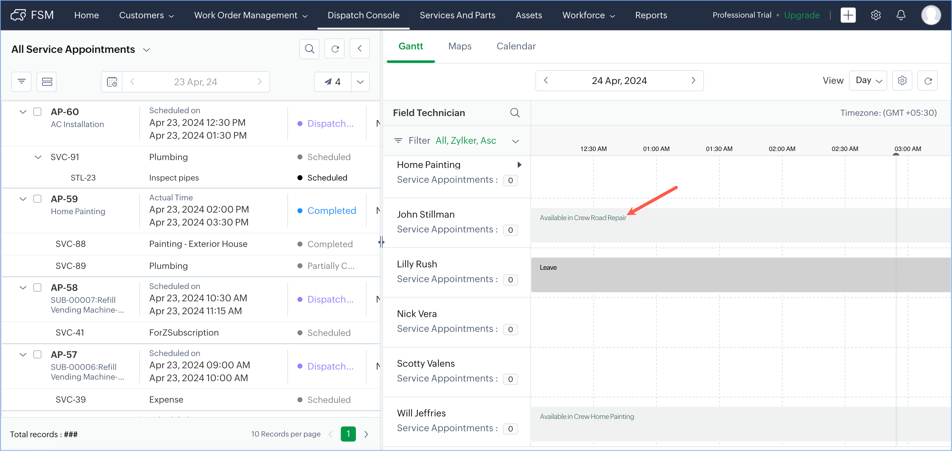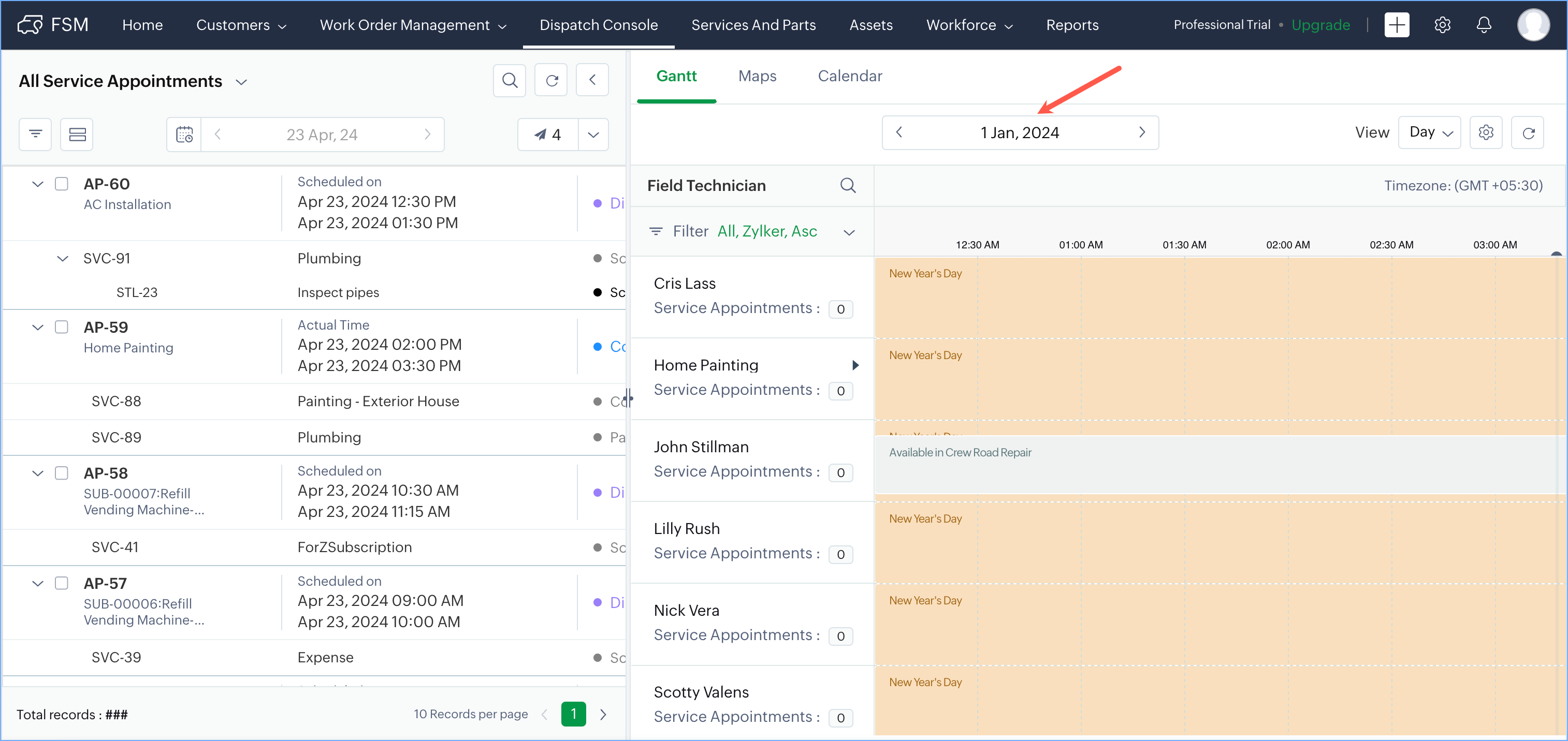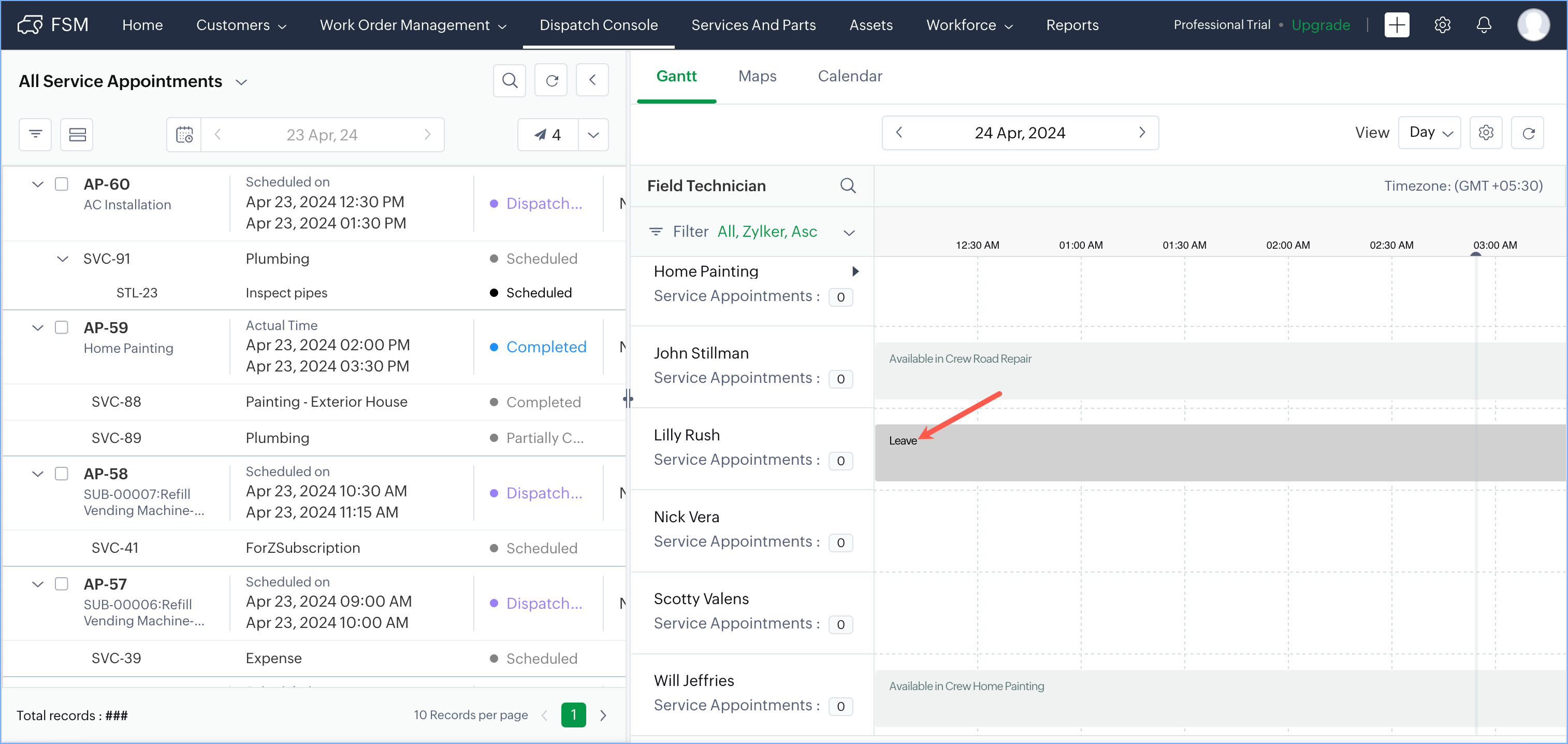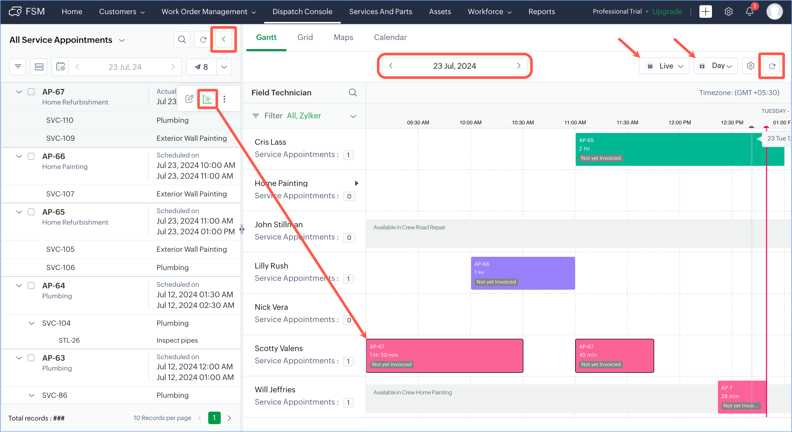 Gantt view shows the service appointments in a timeline. To see the Gantt view, navigate to the