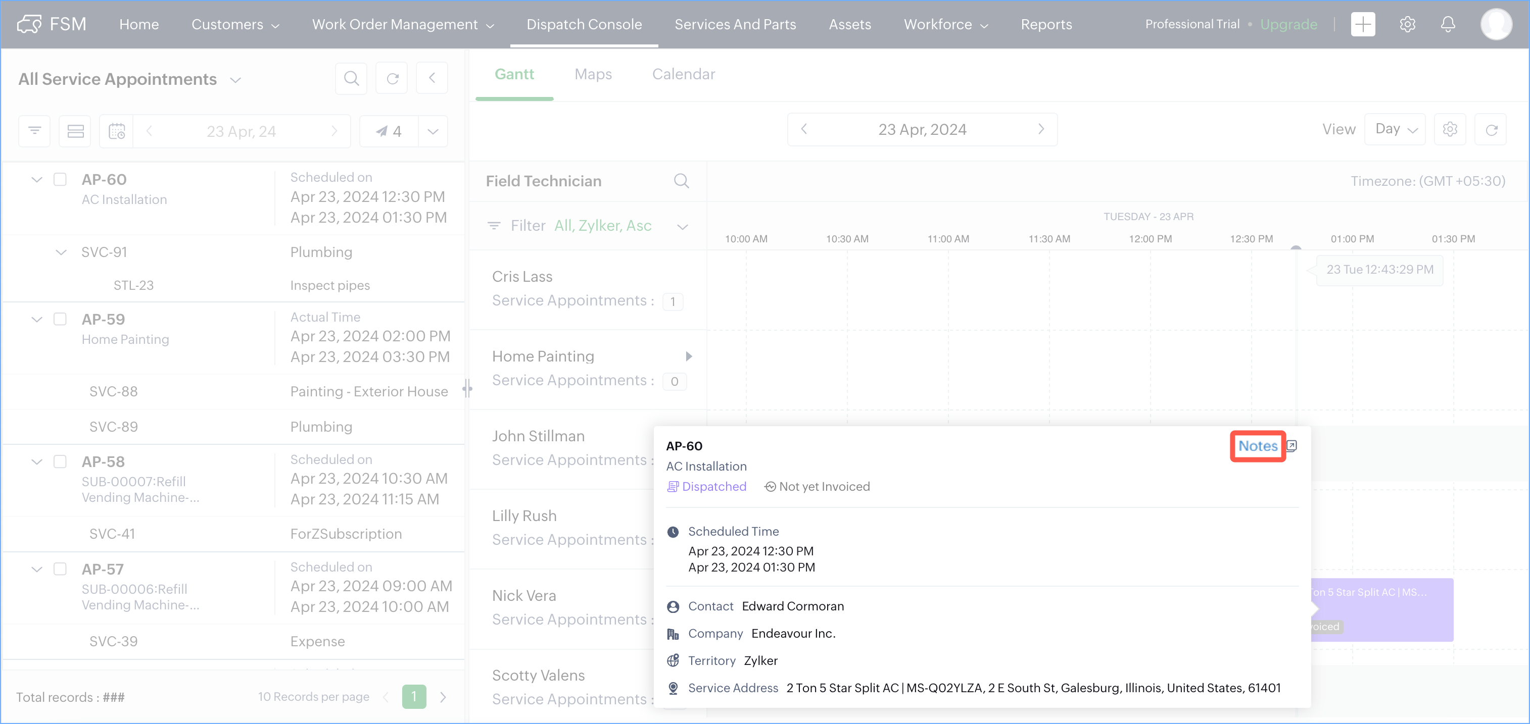 The Service Appointment Details overlay will be opened with the Notes tab selected.