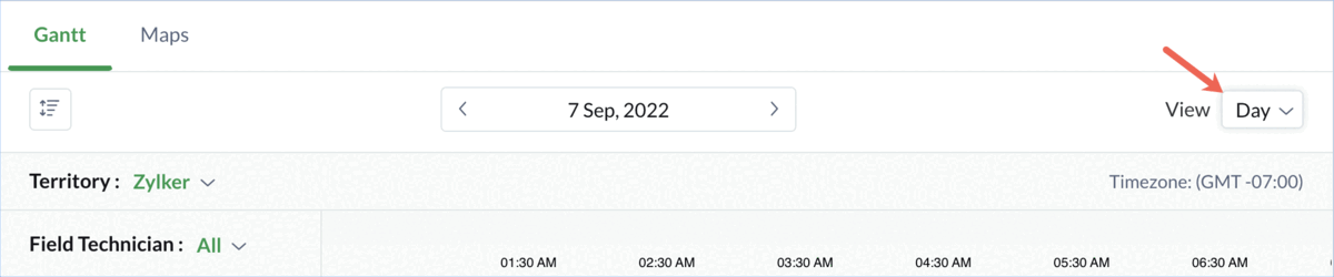- Use the Time Range filter in the Gantt area to choose a day or week for which you want to see the service appointments. Use the View filter to choose a Day or Week for which you want to see the service appointments.