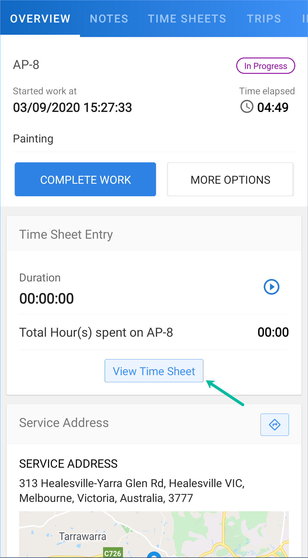 You can view the Time Sheet entries in the web app by selecting the Time Sheets tab in the Service Appointment overlay.