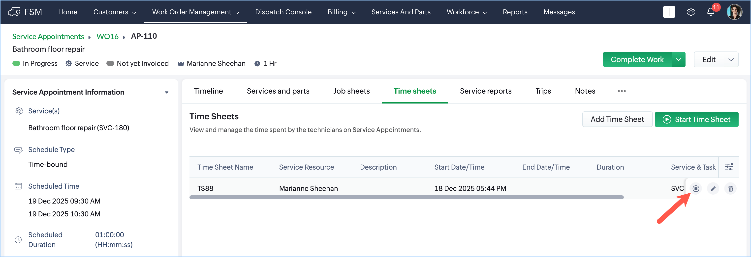 - A Start Time Sheet button becomes available within the Service Appointment.
