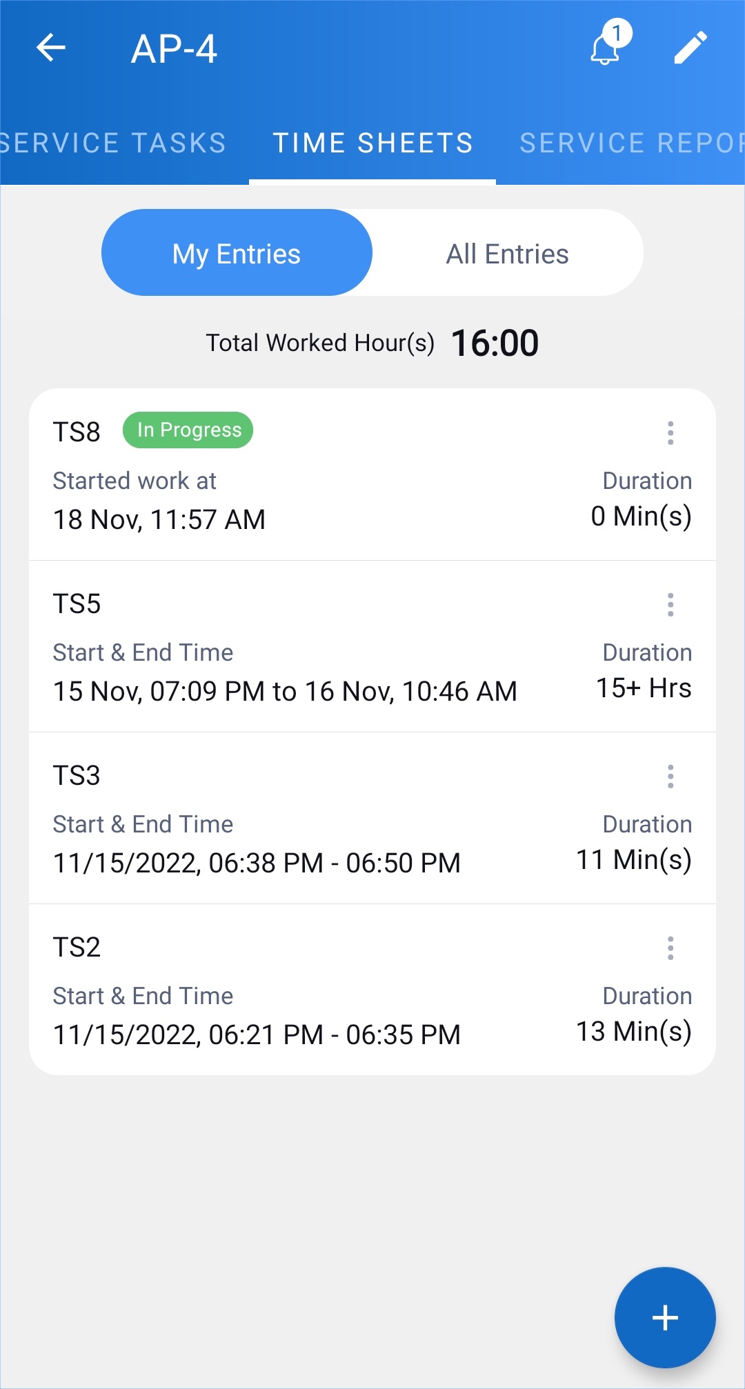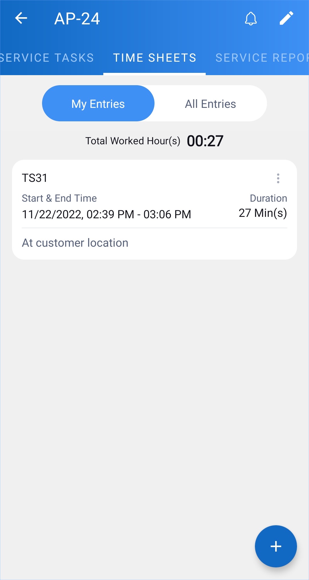 The Time Sheet entries can also be viewed under the Working Hours section of the Service Report in the mobile app.