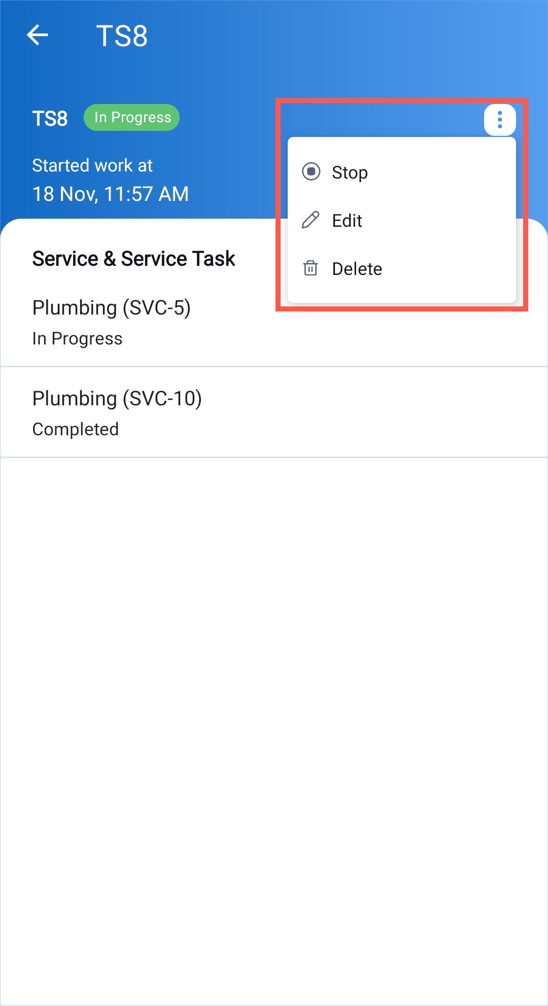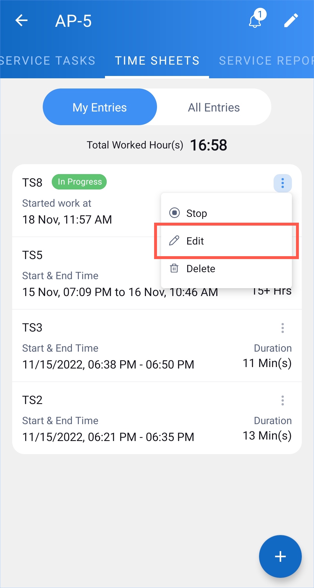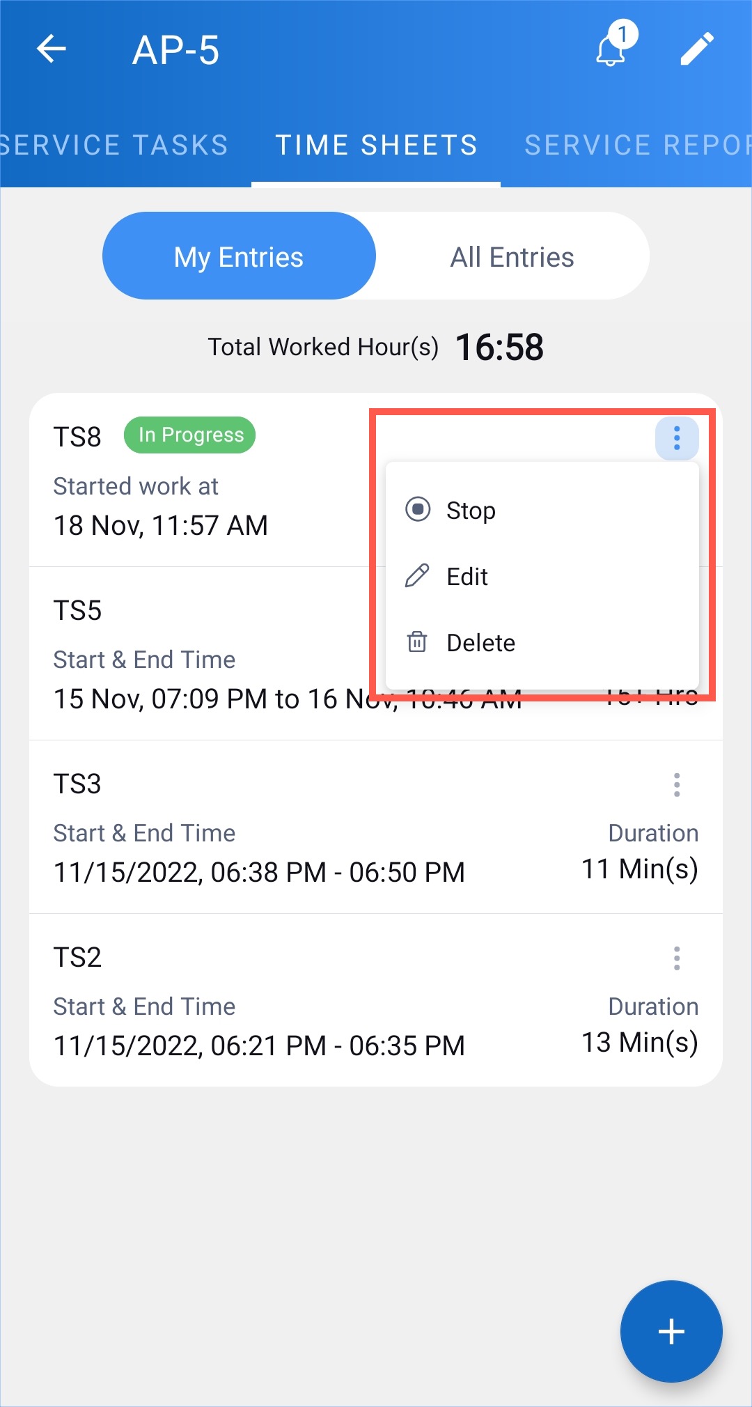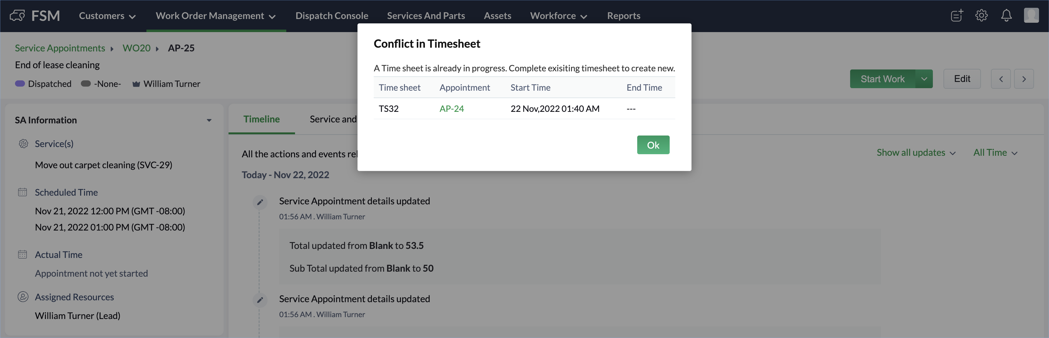 - In the timeline, there will be an entry stating that the time sheet details have been updated by Zoho FSM.