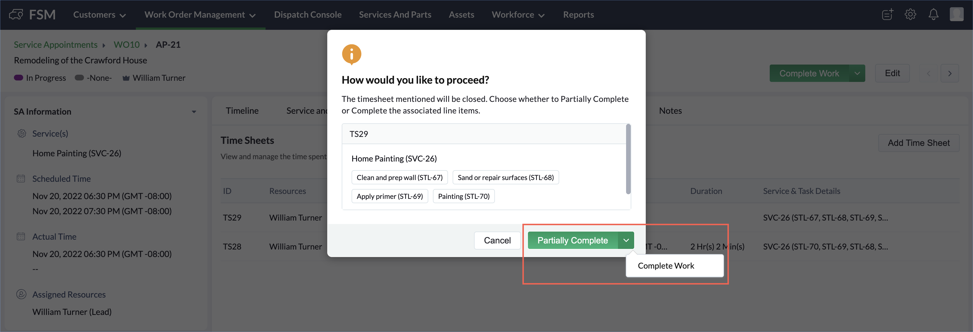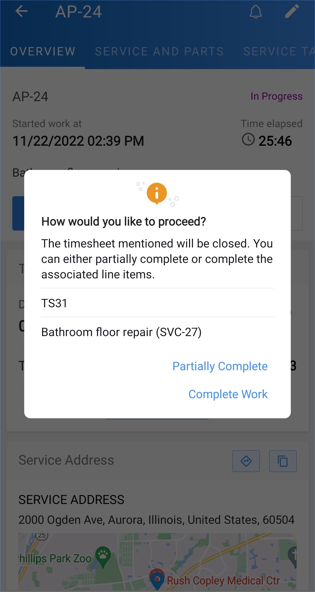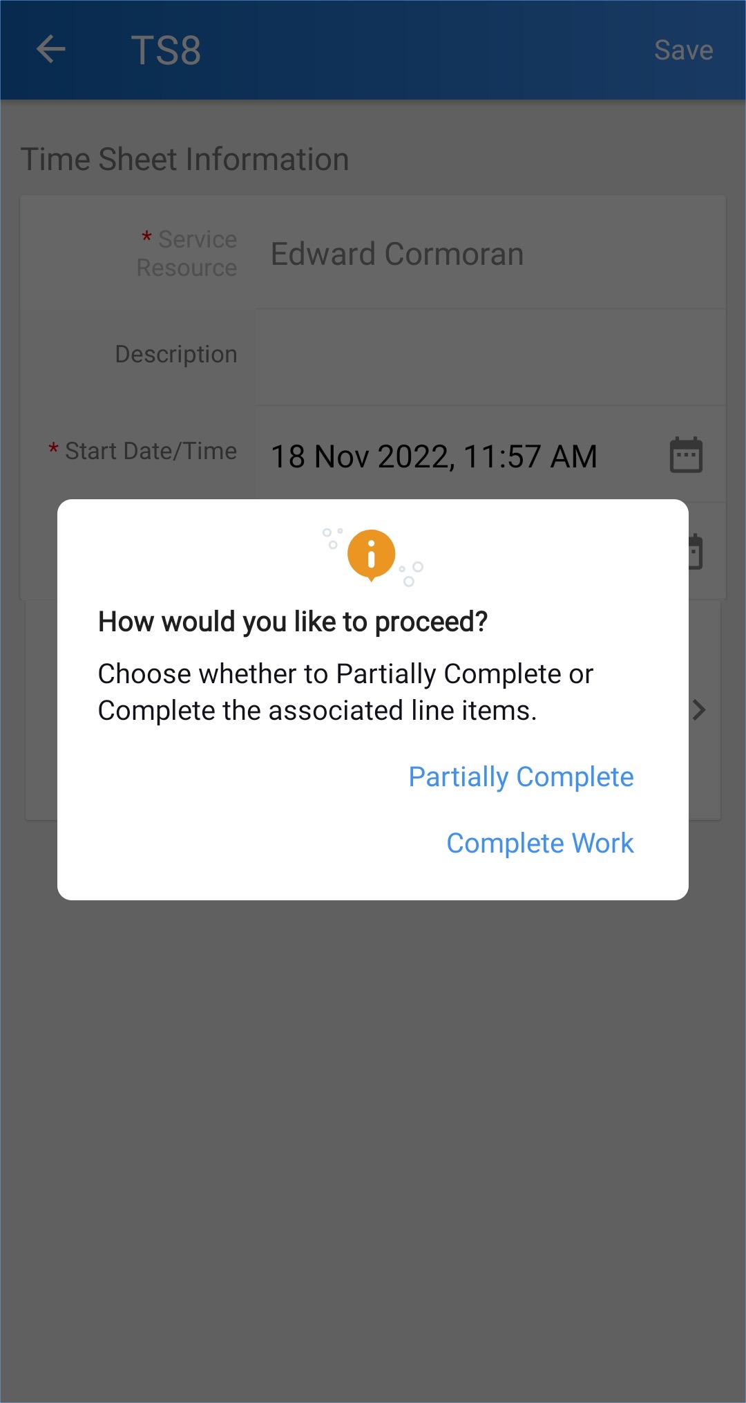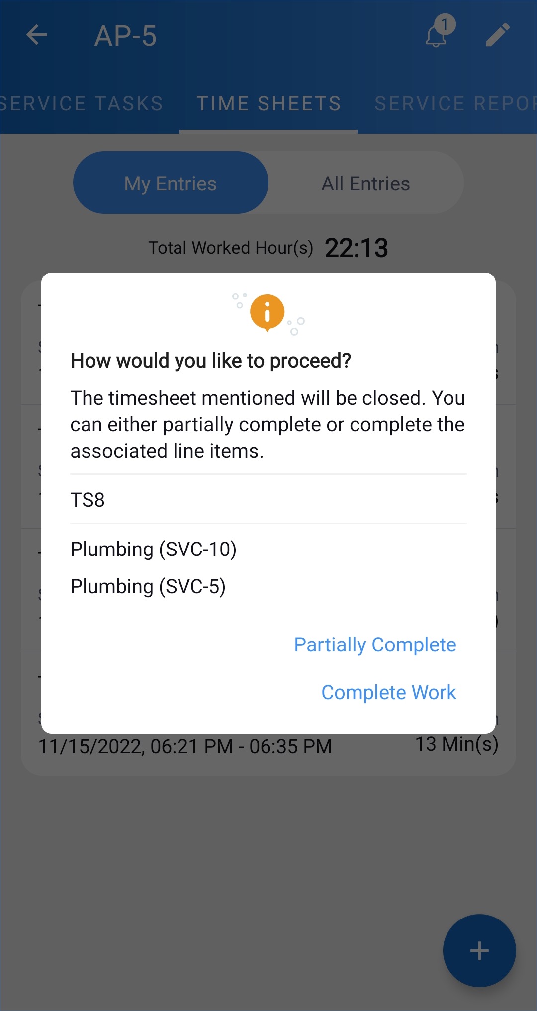 When you try to partially complete or complete a service line item for which there exists multiple ongoing time sheets created by different users, then all these time sheets in which this service line item is used will be Closed and you will have the option to partially complete or complete the service line items.