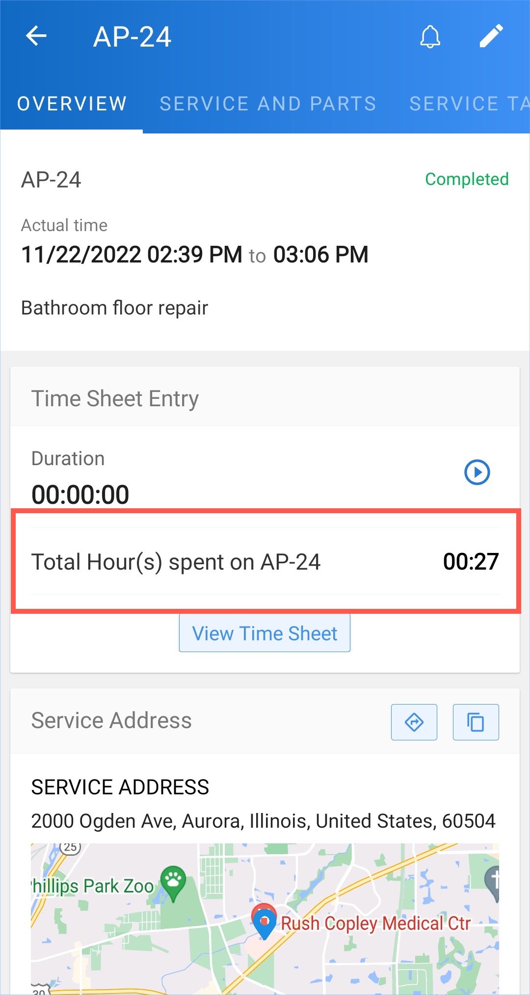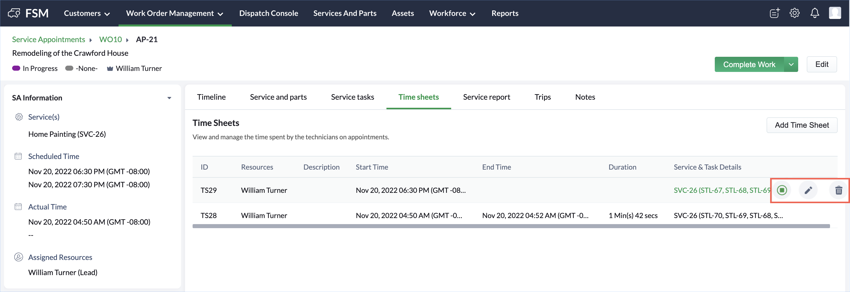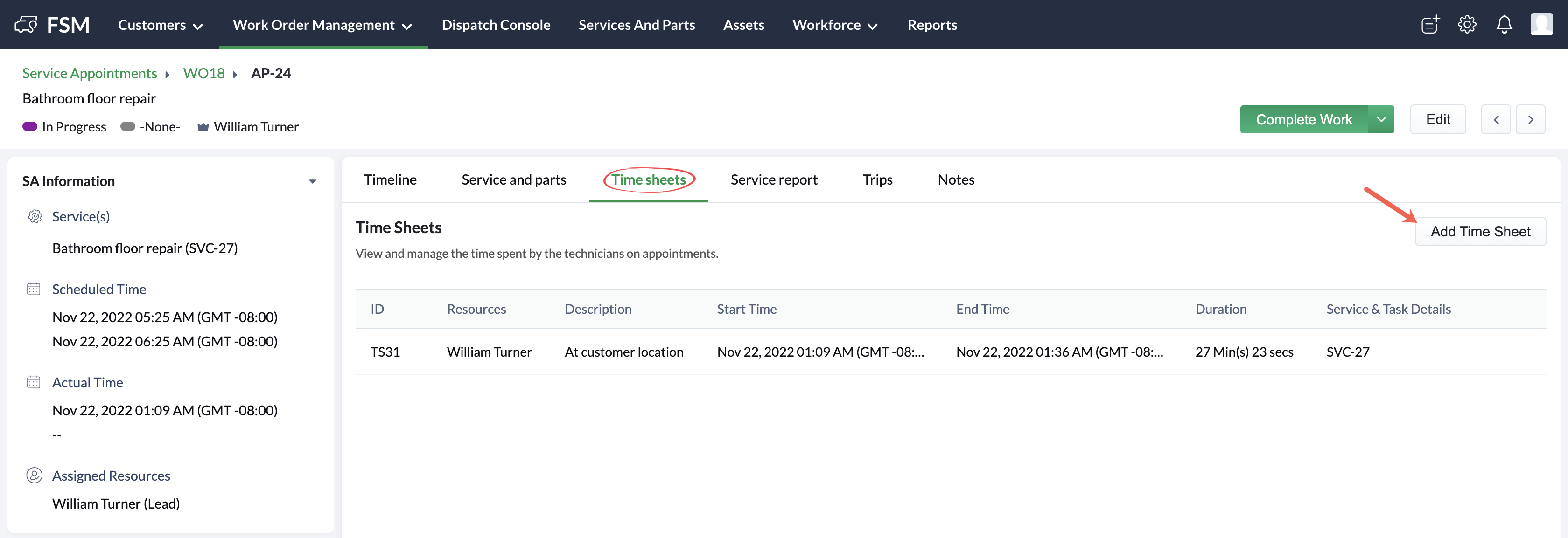 Time spent working on an appointment can be logged using Time Sheets. Time sheet entries can be recorded by the field agent from the FSM mobile app. Time sheets can be also be recorded from the FSM web app.