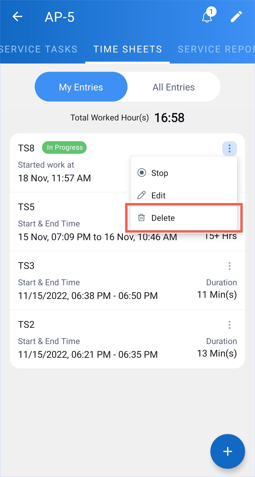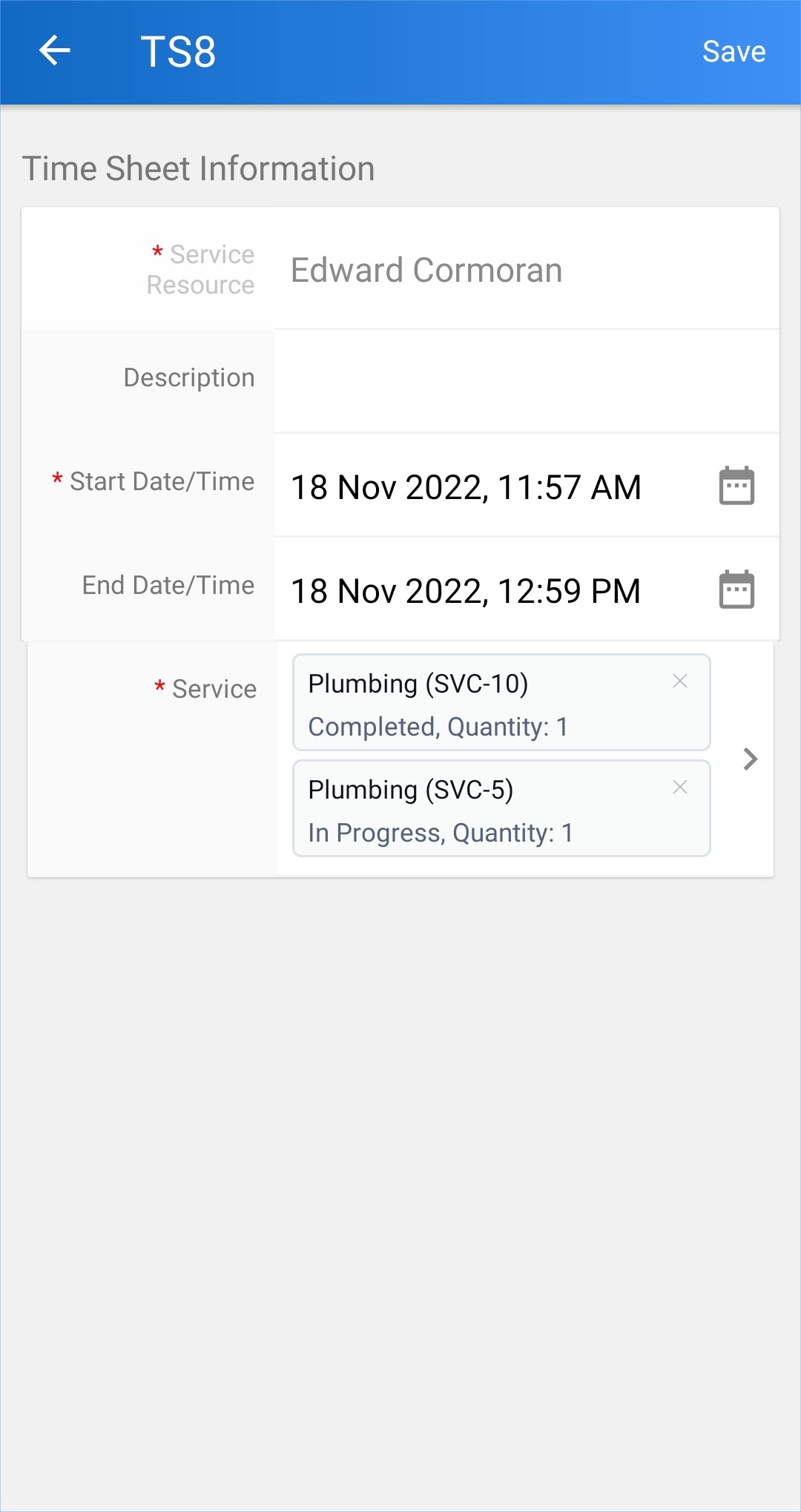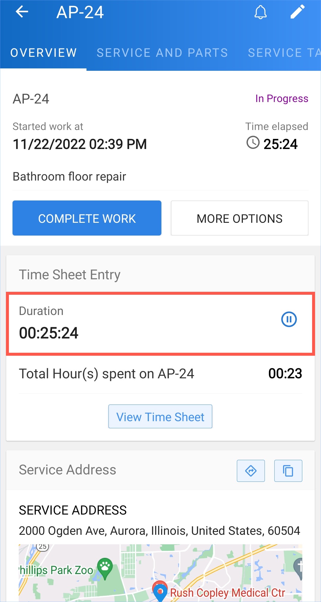 Time spent working on an appointment can be logged using Time Sheets. Time sheet entries can be recorded by the field agent from the FSM mobile app. Time sheets can be also be recorded from the FSM web app.