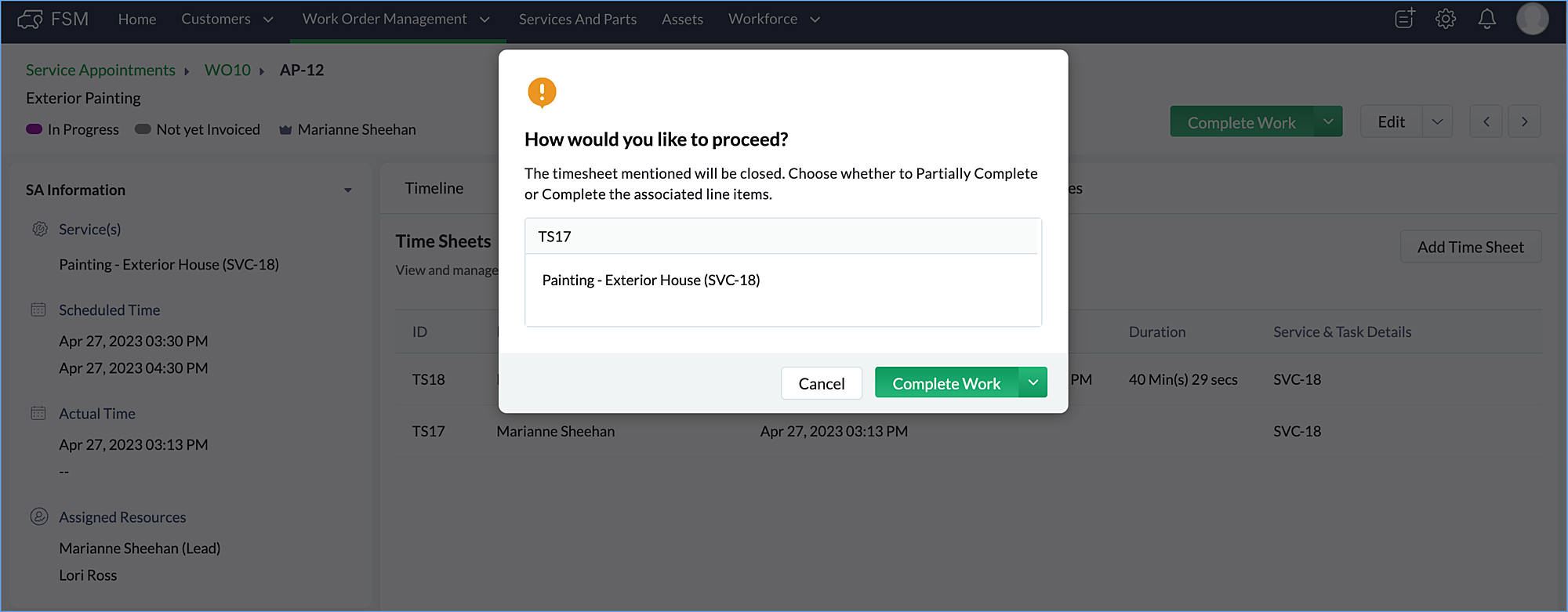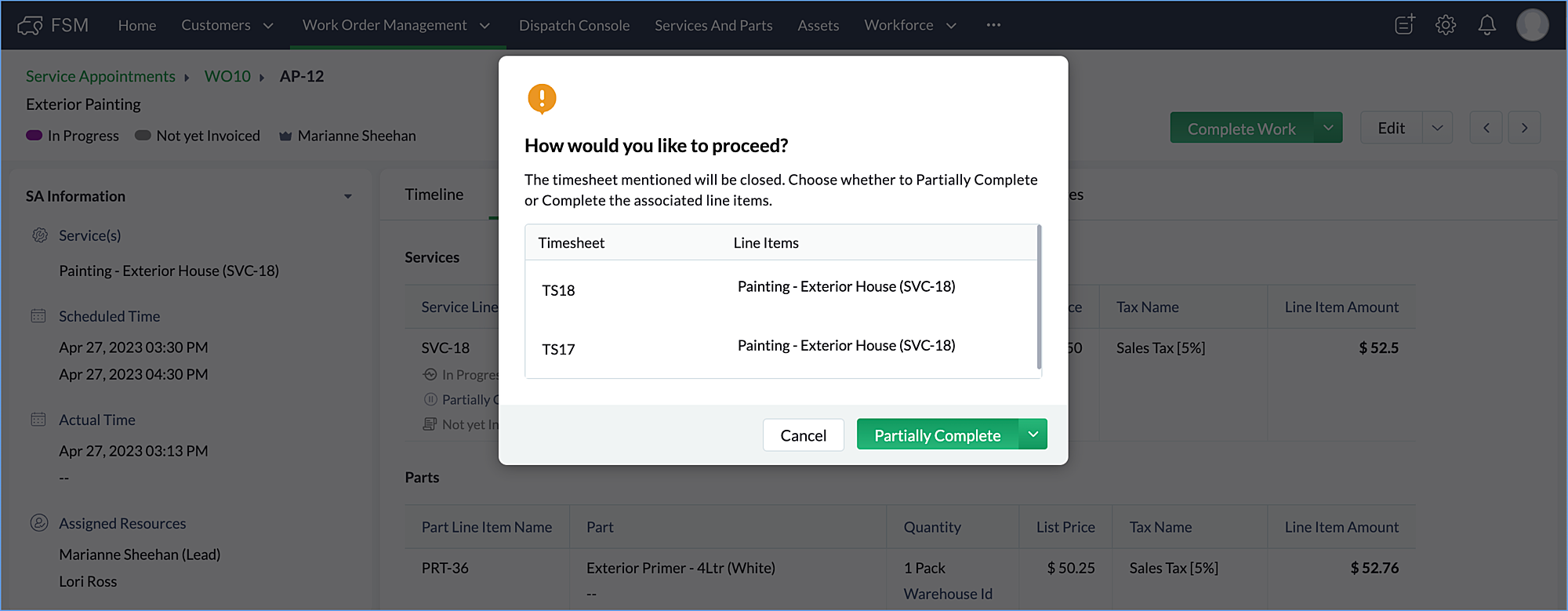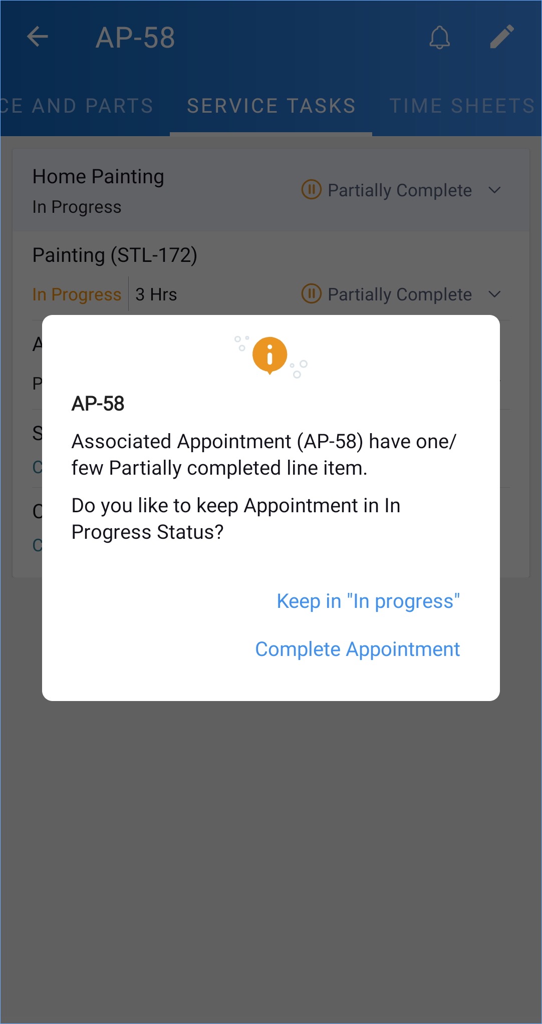 In case there are partially completed line items in the service appointment and the status of the service appointment is In Progress, then you will be shown a confirmation message.