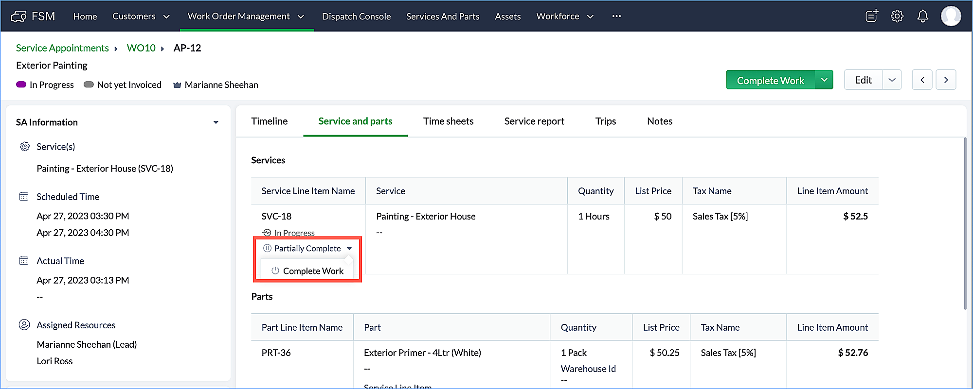 - The status of the service line items will change to Partially Completed. The status of the service appointment will change to In Progress.