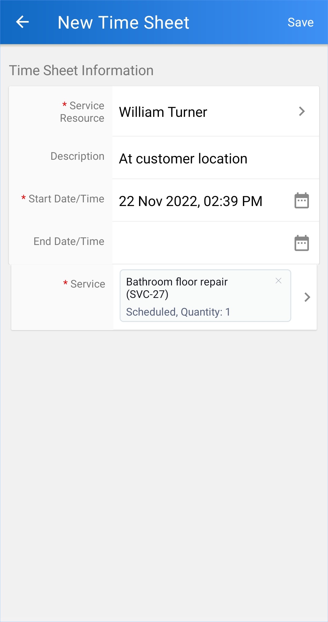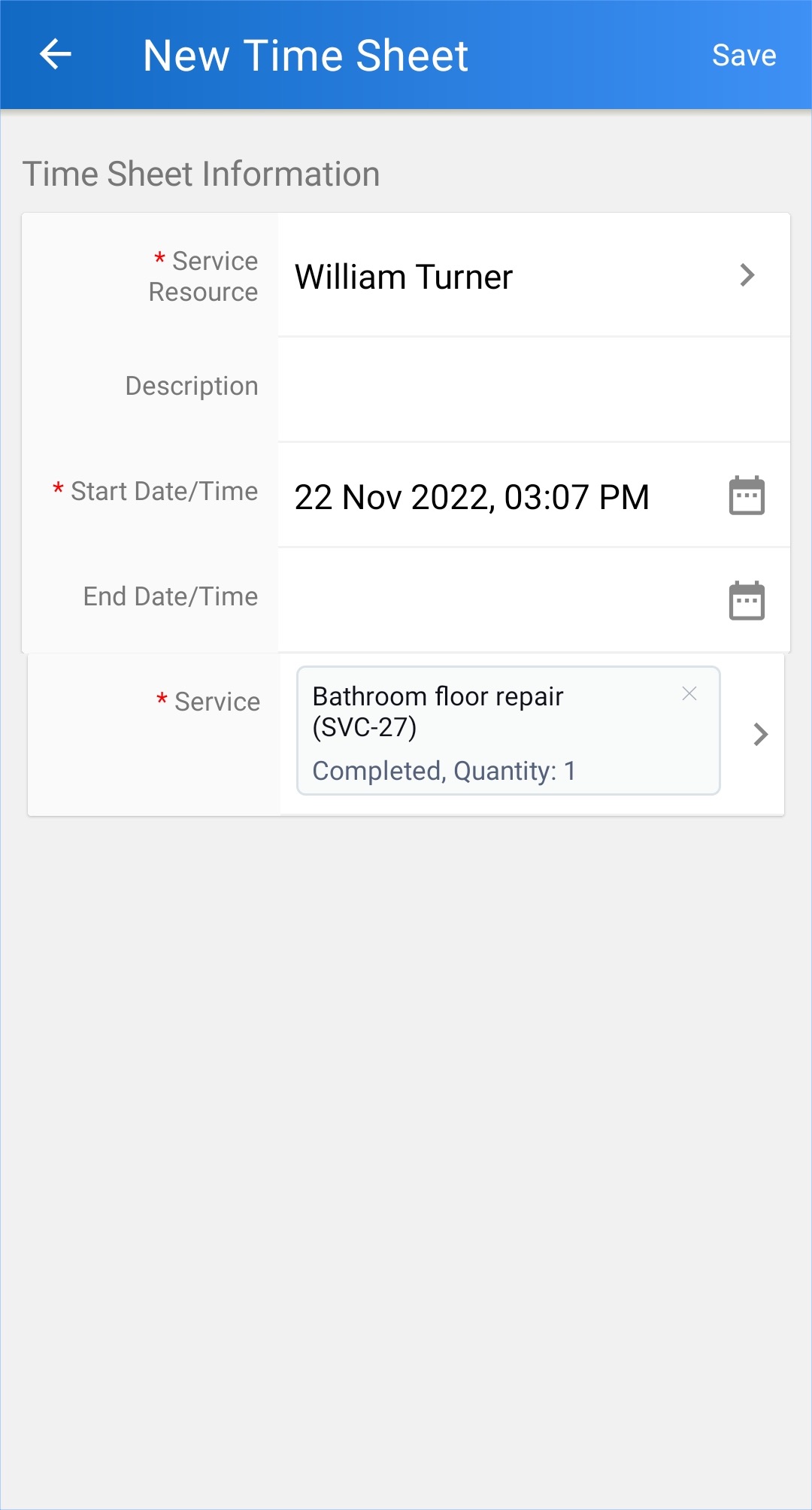 - In the New Time Sheet screen, add the necessary details and click Save.