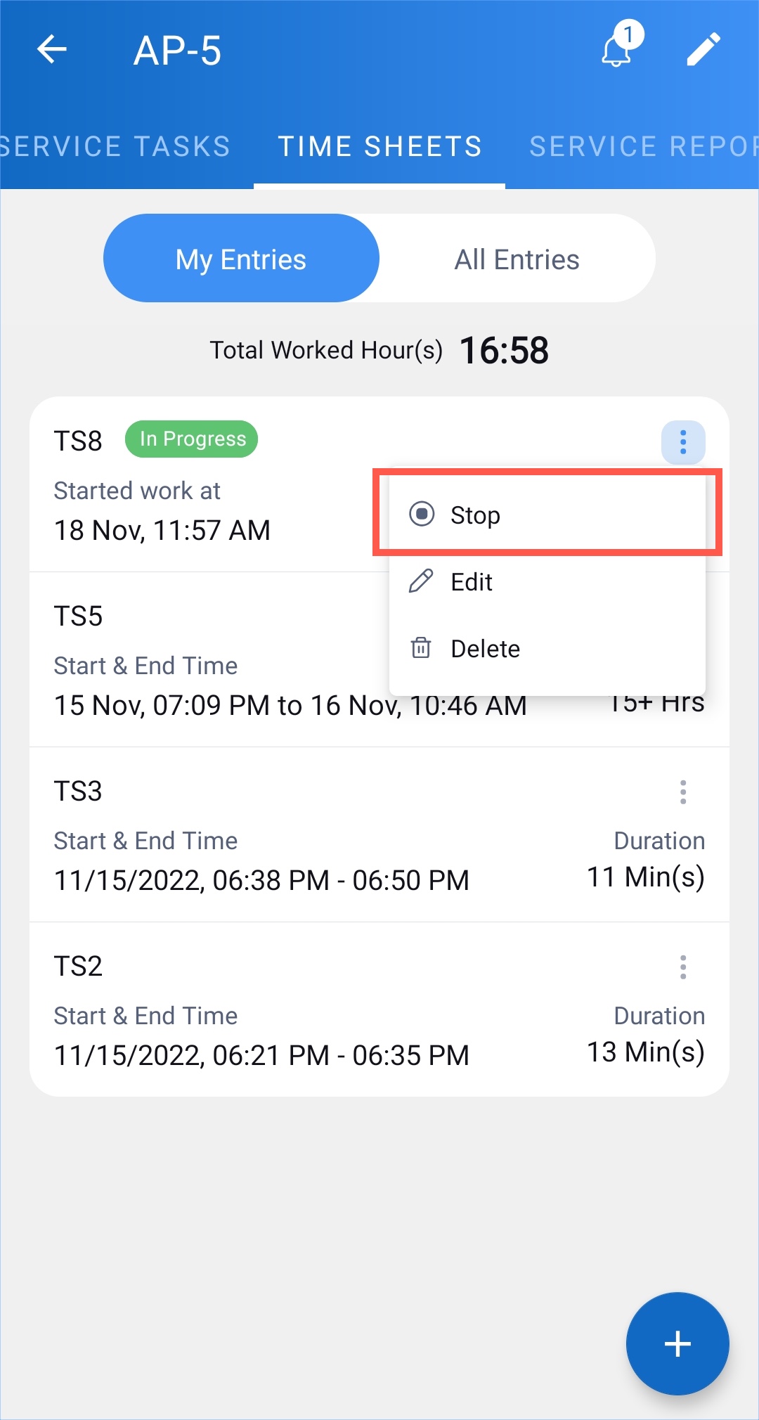 You can also stop the timer for an entry from the Time Sheets tab. Total hours spent so far on the appointment will be displayed. Multiple time sheet entries can be added to an appointment.