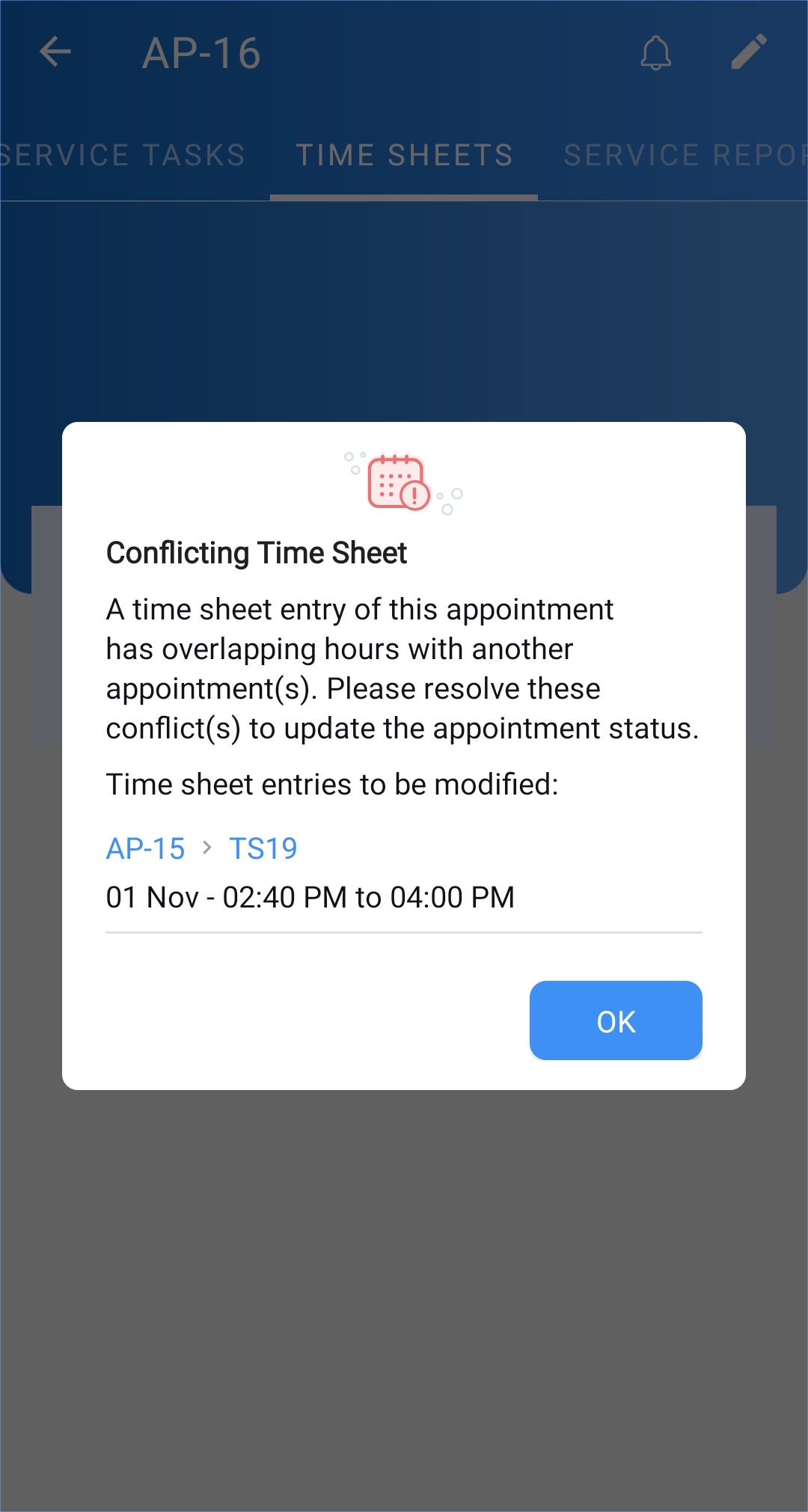 Time sheets cannot have overlapping hours. While editing a time sheet, or stopping a time sheet, if its hours is in conflict with existing time sheets, an error message will be displayed, as shown in the below screenshot. Click on the time sheets mentioned in the message and resolve the conflicts.