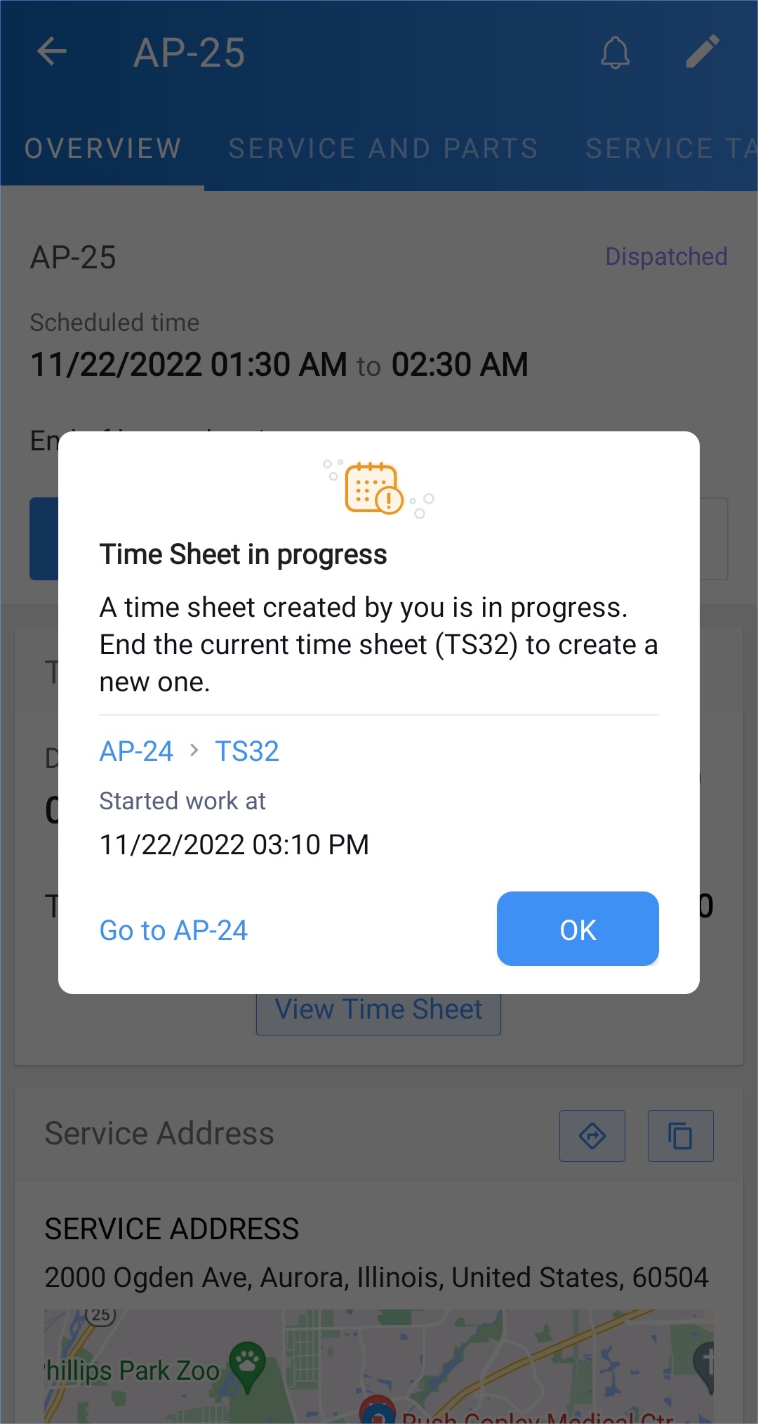 A user can only initiate a single timesheet at a time. If the user attempts to start a timesheet while another is in progress, an error message will be displayed, as shown in the below screenshot. Clicking on GO TO AP-XX will take the user to the appointment whose timesheet is in progress. Once that timesheet is stopped, a new one can be initiated. Since a time sheet is started when you start an appointment, you will encounter this error when you try to start an appointment while a timesheet started by you is in progress.