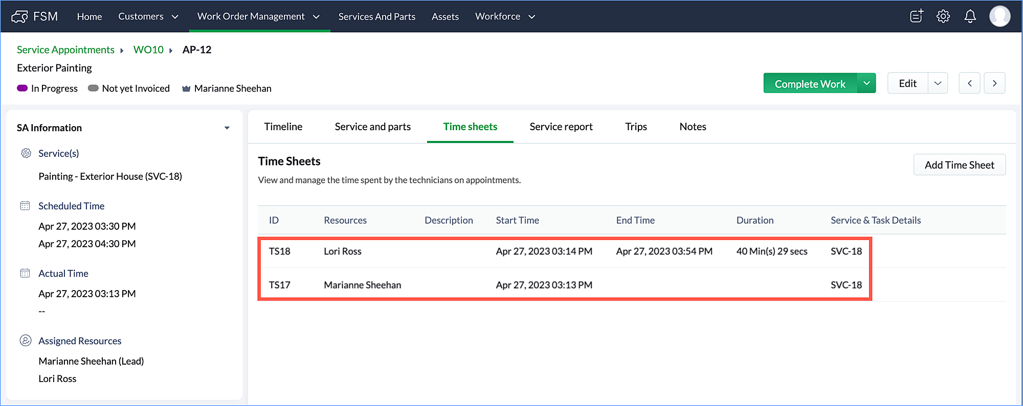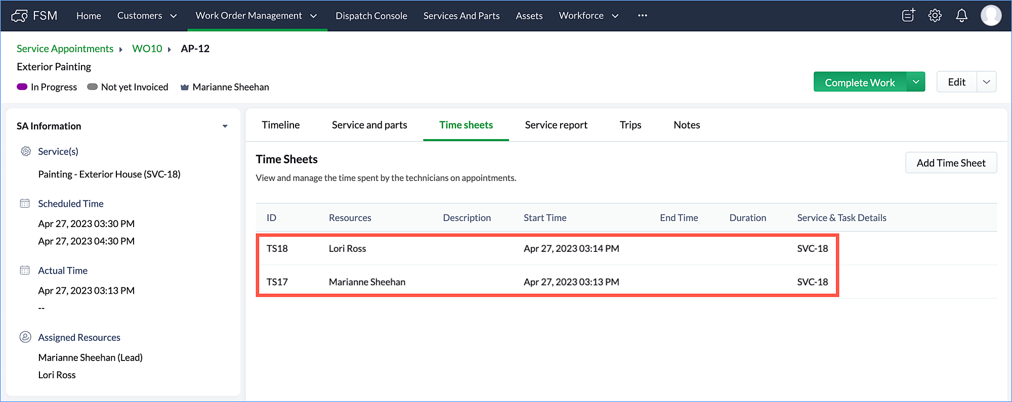 Here is an example to illustrate this. In a service appointment AP-12, the assigned service resources Marianne Sheehan and Lori Ross have simultaneously created time sheets TS17, and TS18 for the same Service Line Item SVC-18 (refer to the screenshot below).