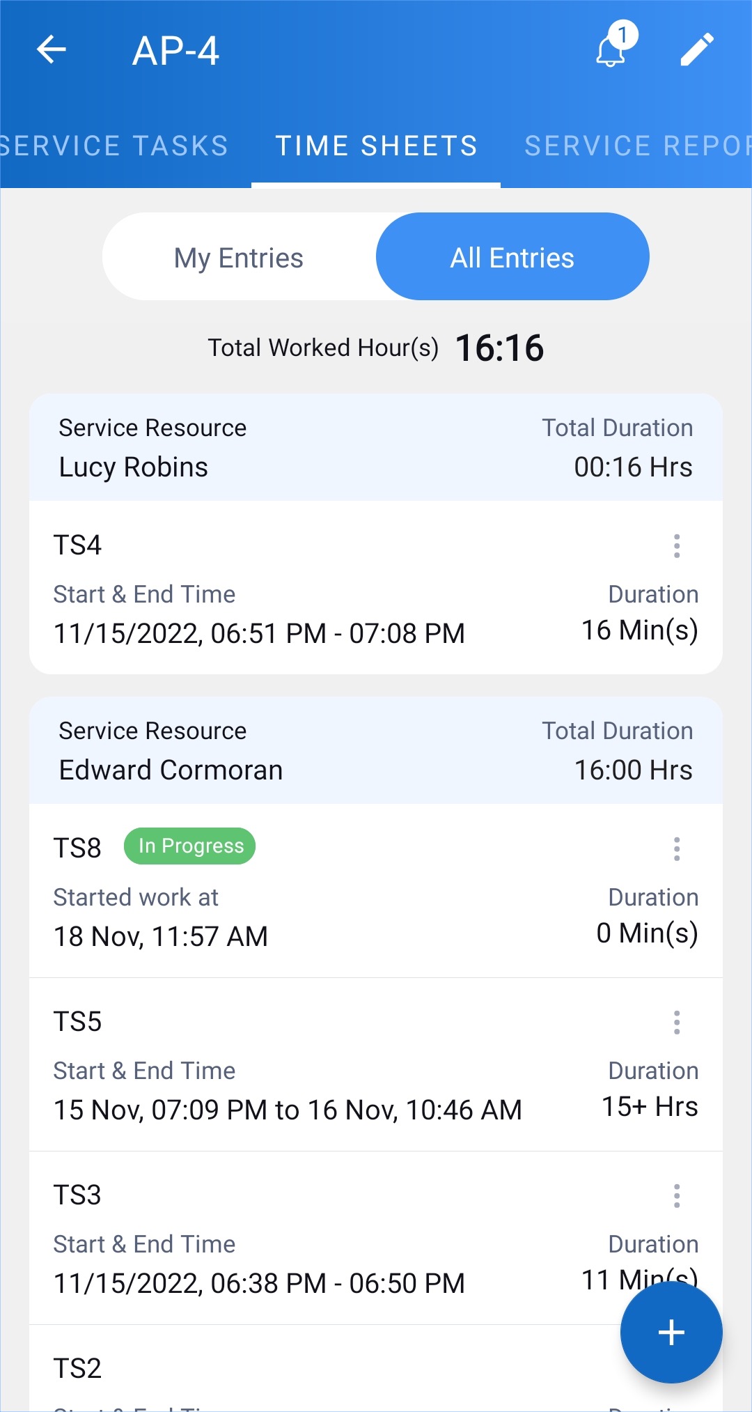 All the time sheet entries for the appointment will be under the Time Sheets tab. When more than one field agents are assigned to an appointment, the time sheet entries will be under two tabs. Under My Entries, all entries made by the logged in agent are displayed. Under All Entries, entries made by all the agents assigned to the appointment are displayed. The entries will be grouped by the agent name.