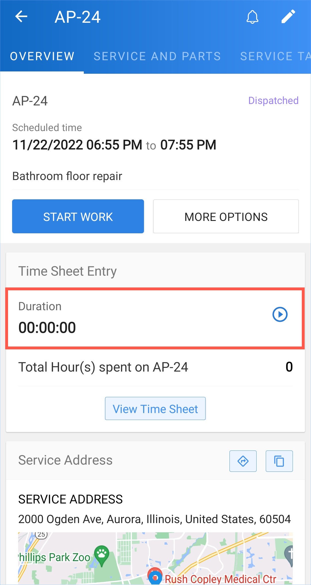 - From the Home screen or the All Service Appointments list view screen, select the appointment you want to add the time sheets to.