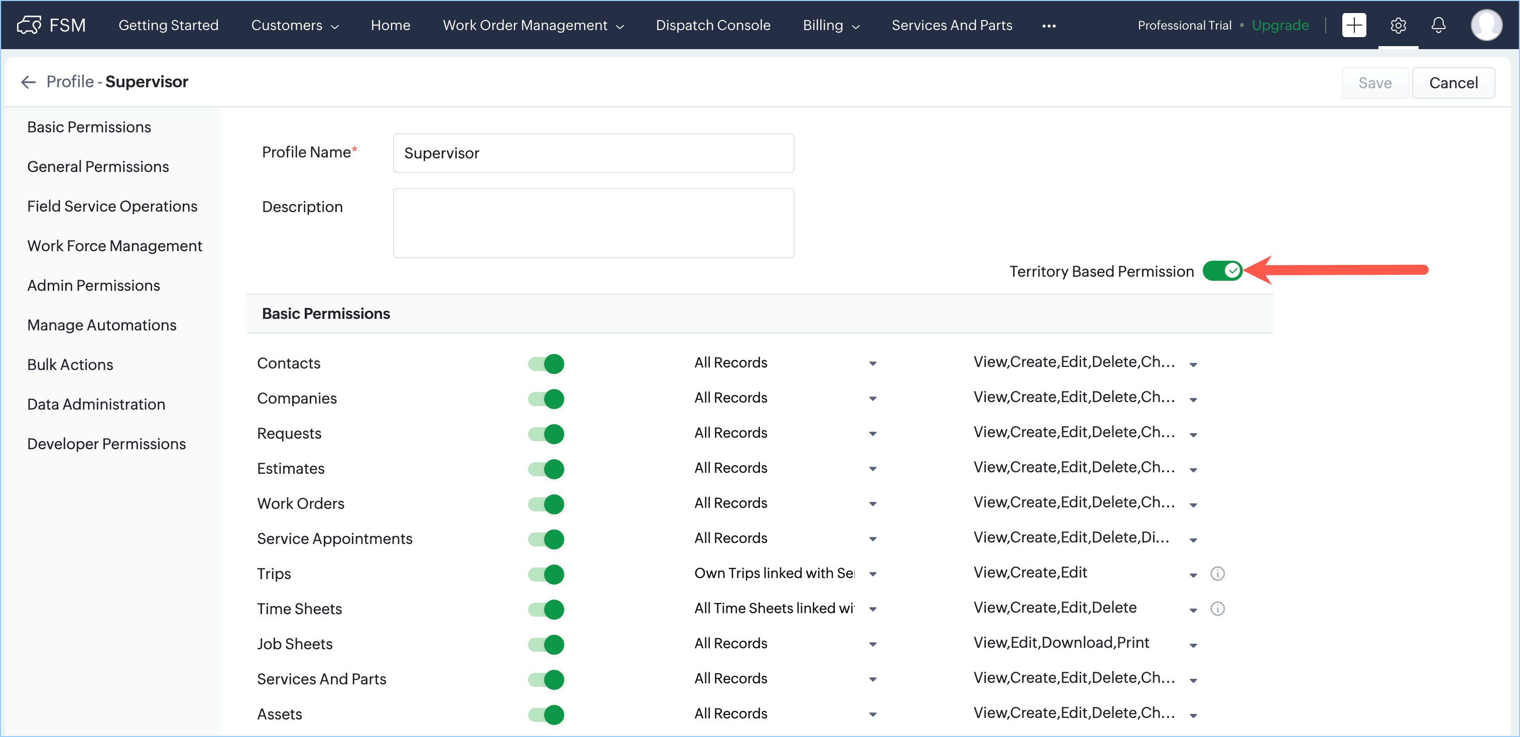 Territory-based Permission in Zoho FSM allows you to control user access to records based on the