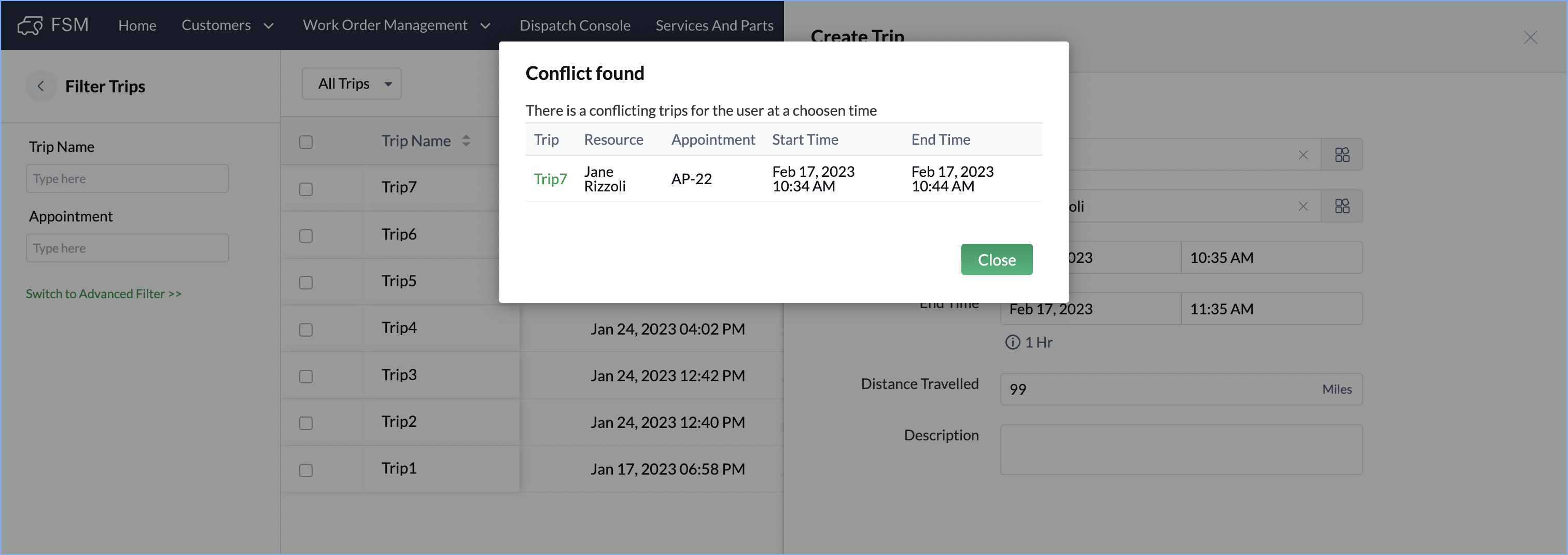 While creating, or editing a trip of a service appointment that is assigned to a particular service resource, if its hours is in conflict with existing trips of the same service appointment assigned to the same service resource, an error message will be displayed, as shown in the below screenshot. Click on the trips mentioned in the message and resolve the conflicts.