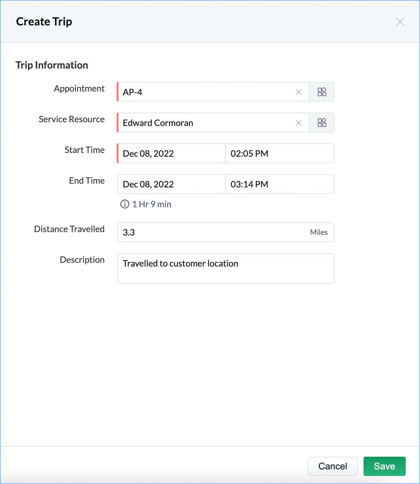 A Trip represents the travel undertaken by a field agent during their workday. It helps track the field agent’s travel time and distance—whether they are commuting to a service location, moving between appointments, or traveling as part of any service-related activity. The details of trips can be accessed from the Trips menu under the Workforce tab. Trip details can be added for service appointments.