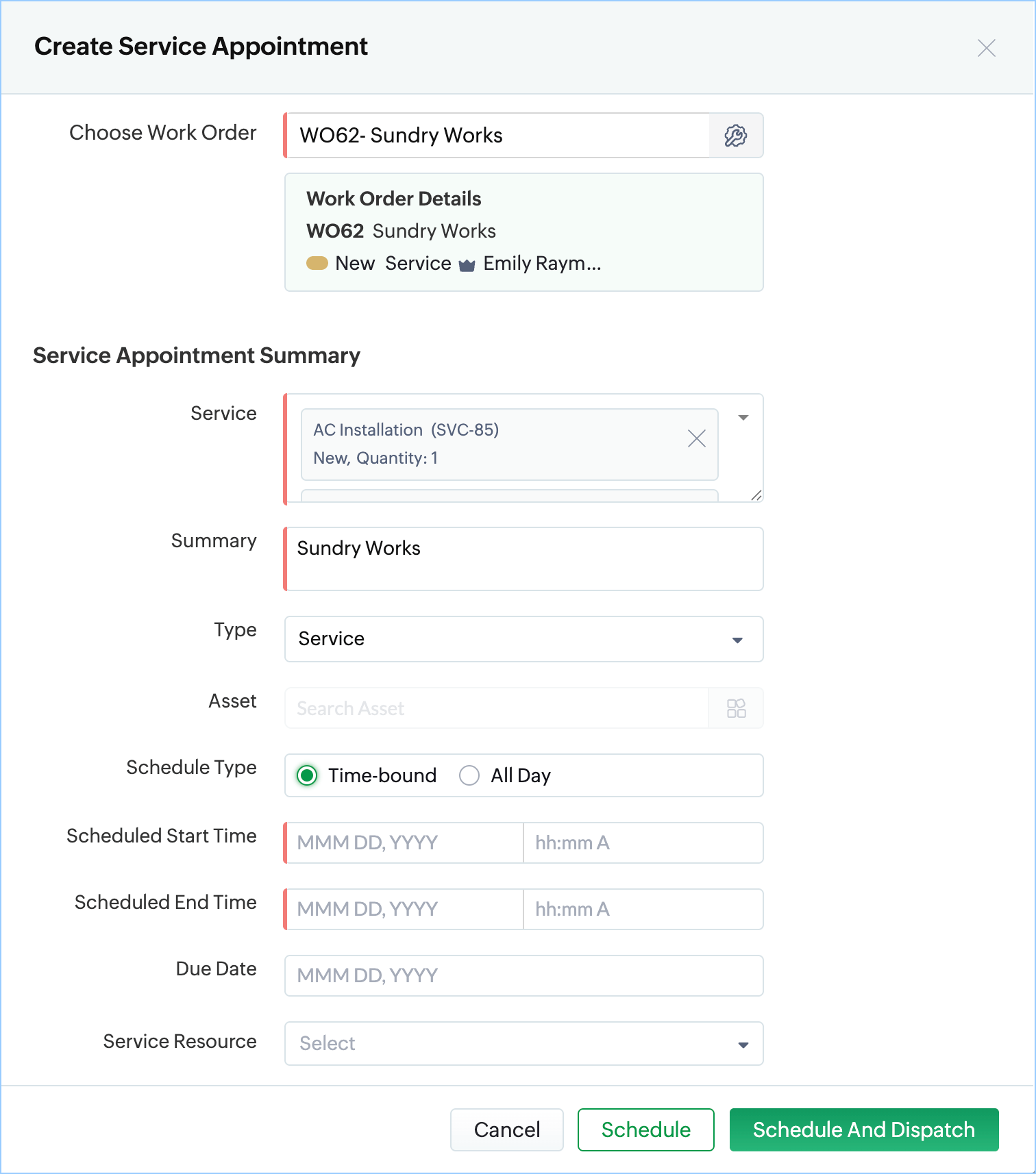 The Scheduled Start Date Time and Scheduled End Date Time should be within the same day. Use multi-day scheduling to schedule an appointment spanning multiple days. - A Service Resource (Field Agent or Crew)